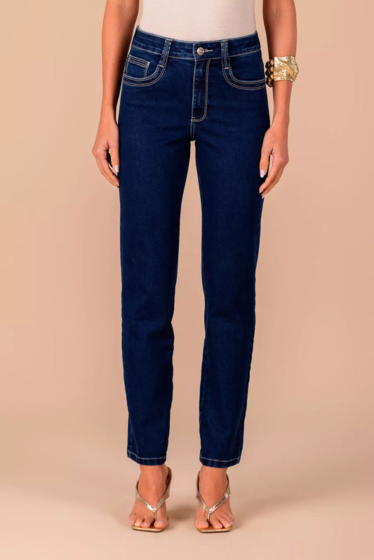 calça jeans pantacourt cintura intermediária com detalhe lateral