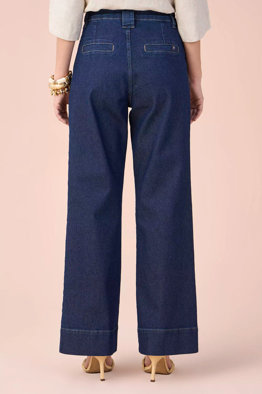 calça jeans pantalona cintura intermediária com pregas