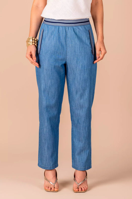 calça malha denim reta cintura intermediária cós elástico