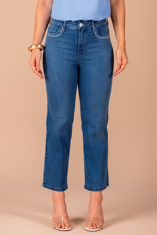 calça jeans corsário cintura intermediária com bordado e cristais