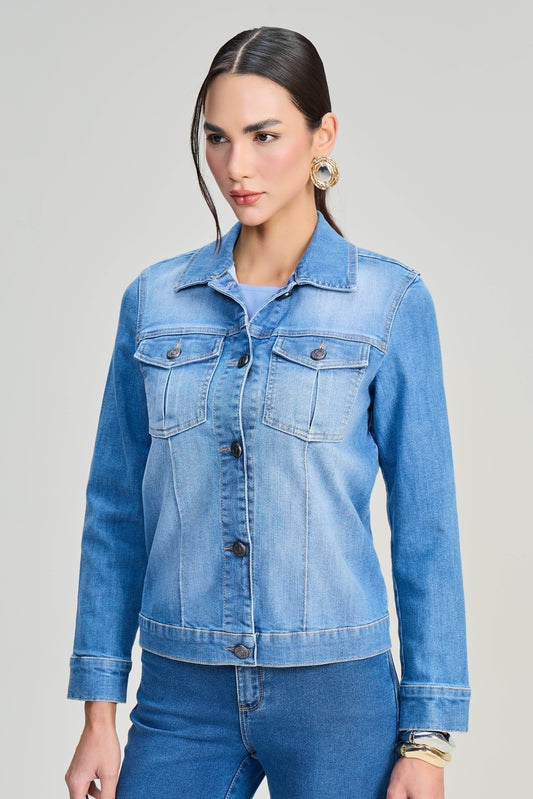 jaqueta jeans manga longa com bolsos sobrepostos