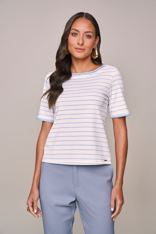 t-shirt malha manga curta listrada com bordados