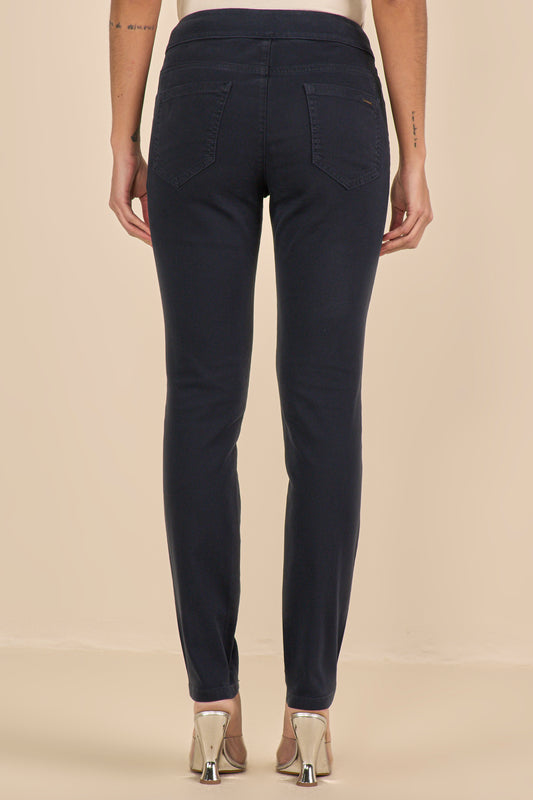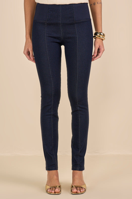 conjunto sarja blusa com assimetria e calça reta cós de elástico