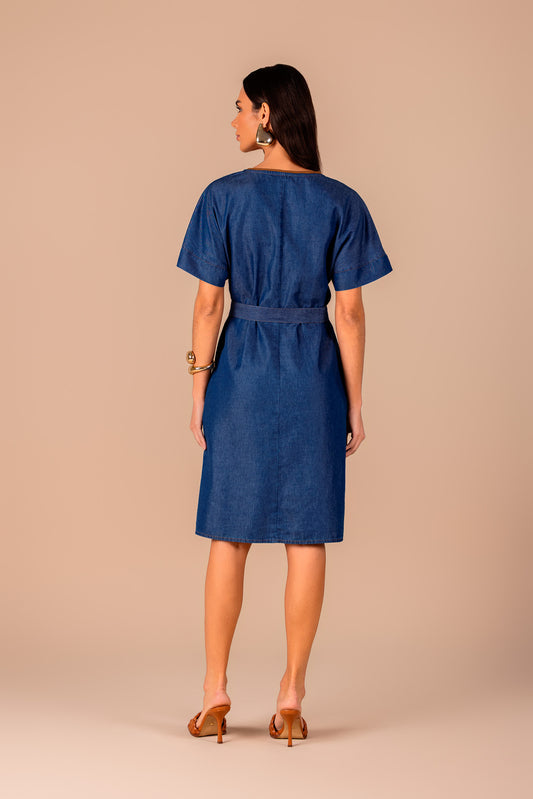 vestido sarja curto com manga ampla e cinto