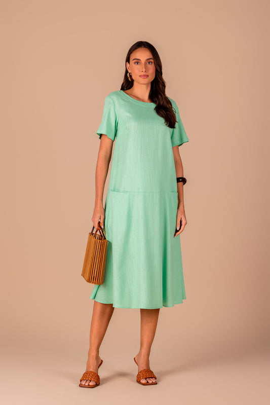 vestido viscose midi com recorte e bolsos