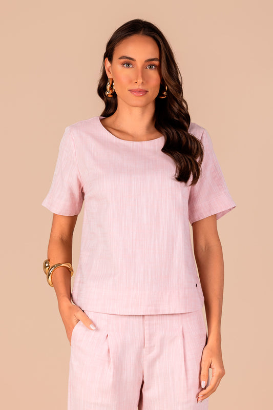 conjunto viscose blusa manga curta e calça reta com mix de tecidos