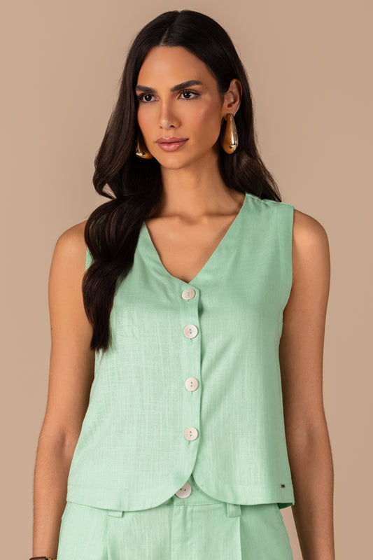 conjunto viscose colete com recortes e bermuda midi com lapelas