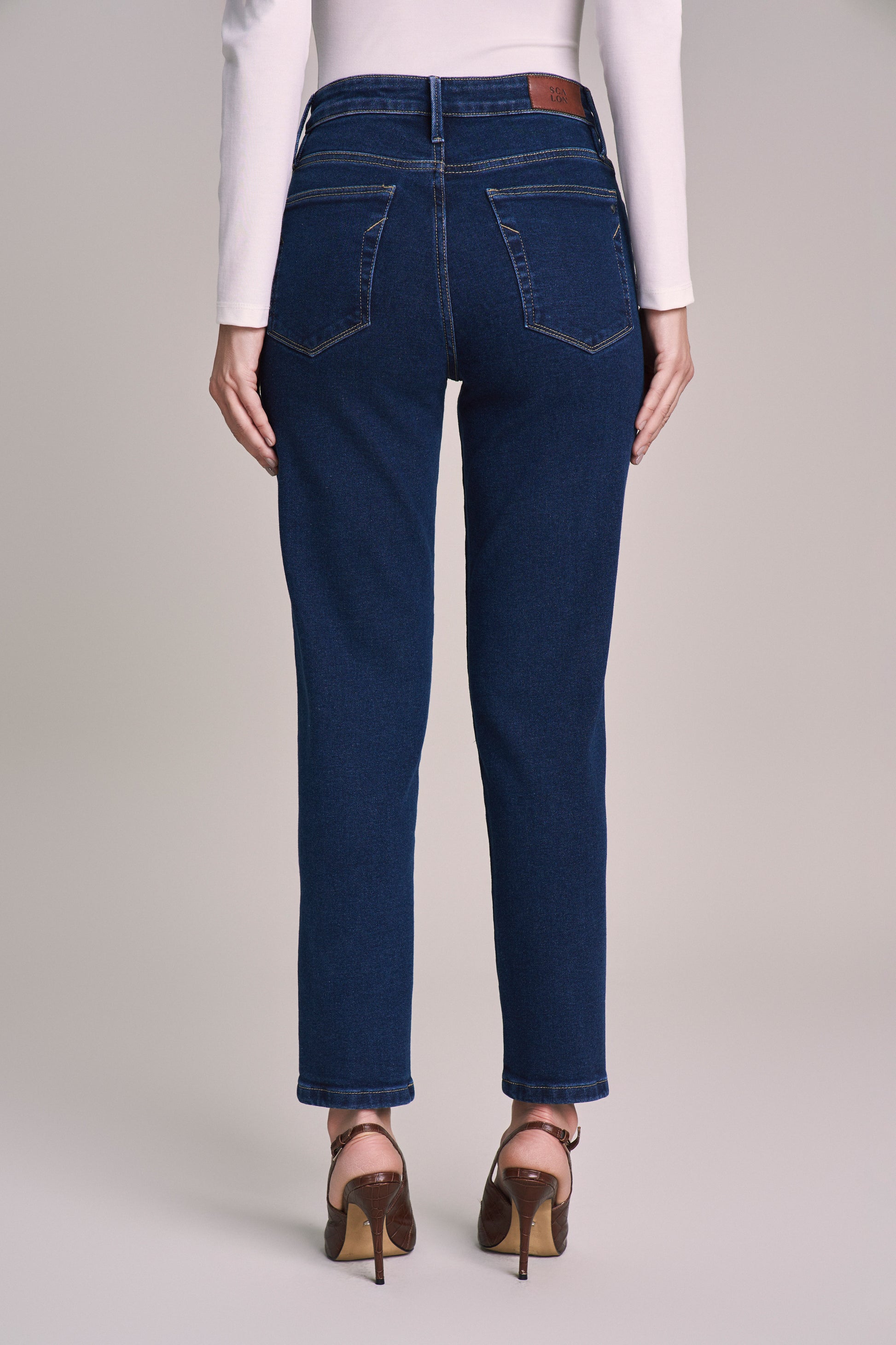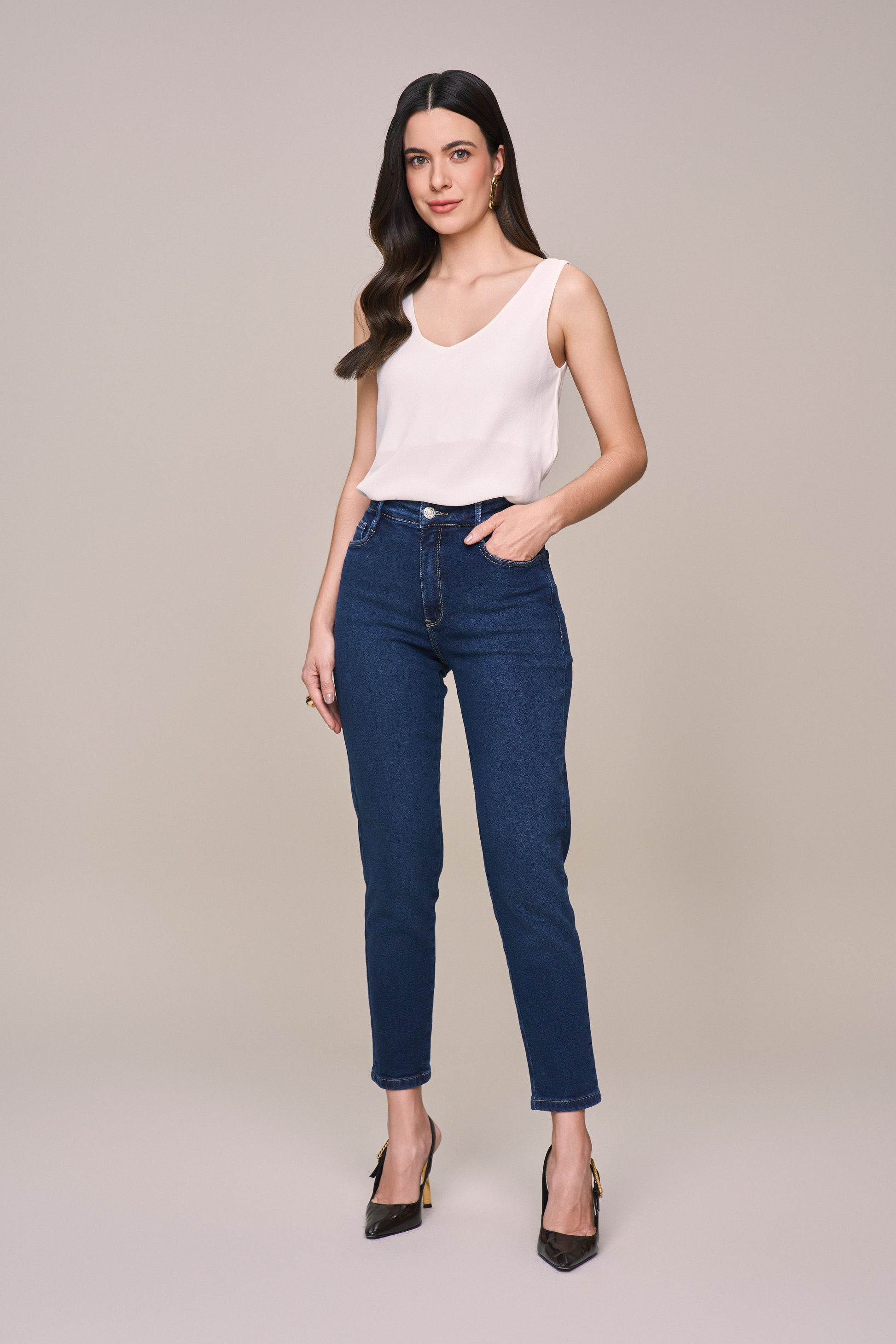 calça jeans mom cintura intermediária pesponto decorativo bolso