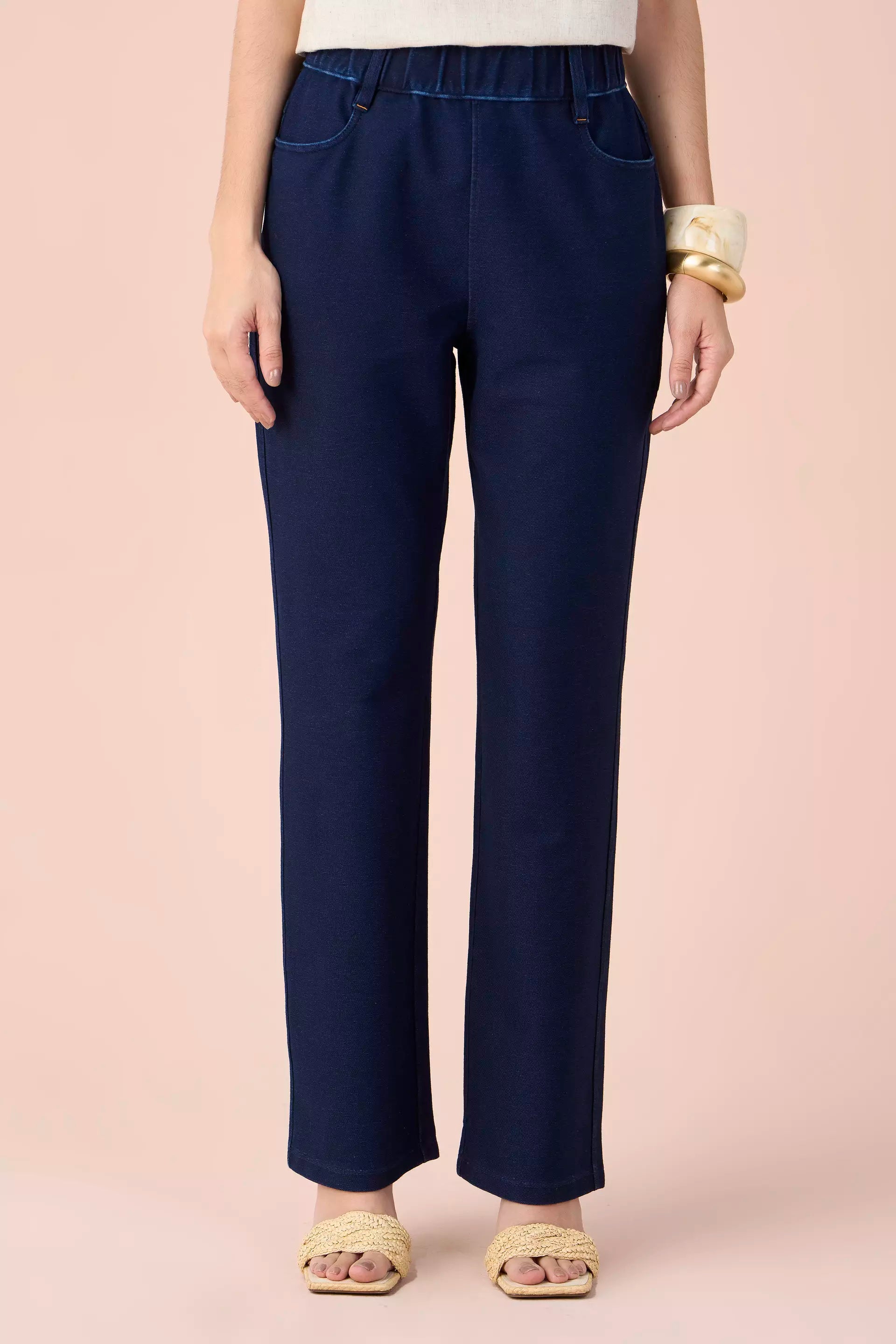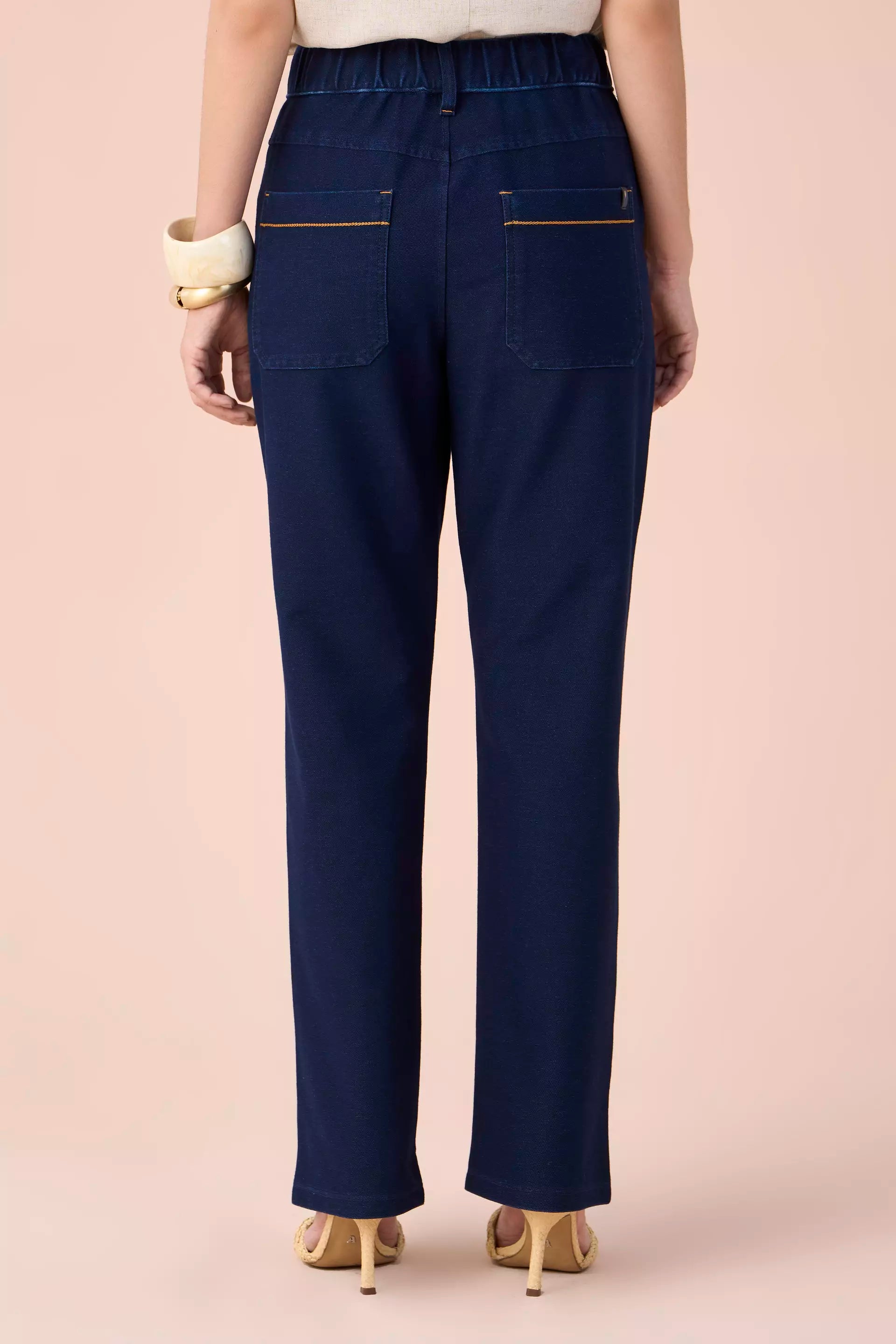 calça malha denim reta cintura intermediária cós elástico solto ao corpo malha denim ponto corrente use para um look casual 50% algodao 43% poliester 7% elastano