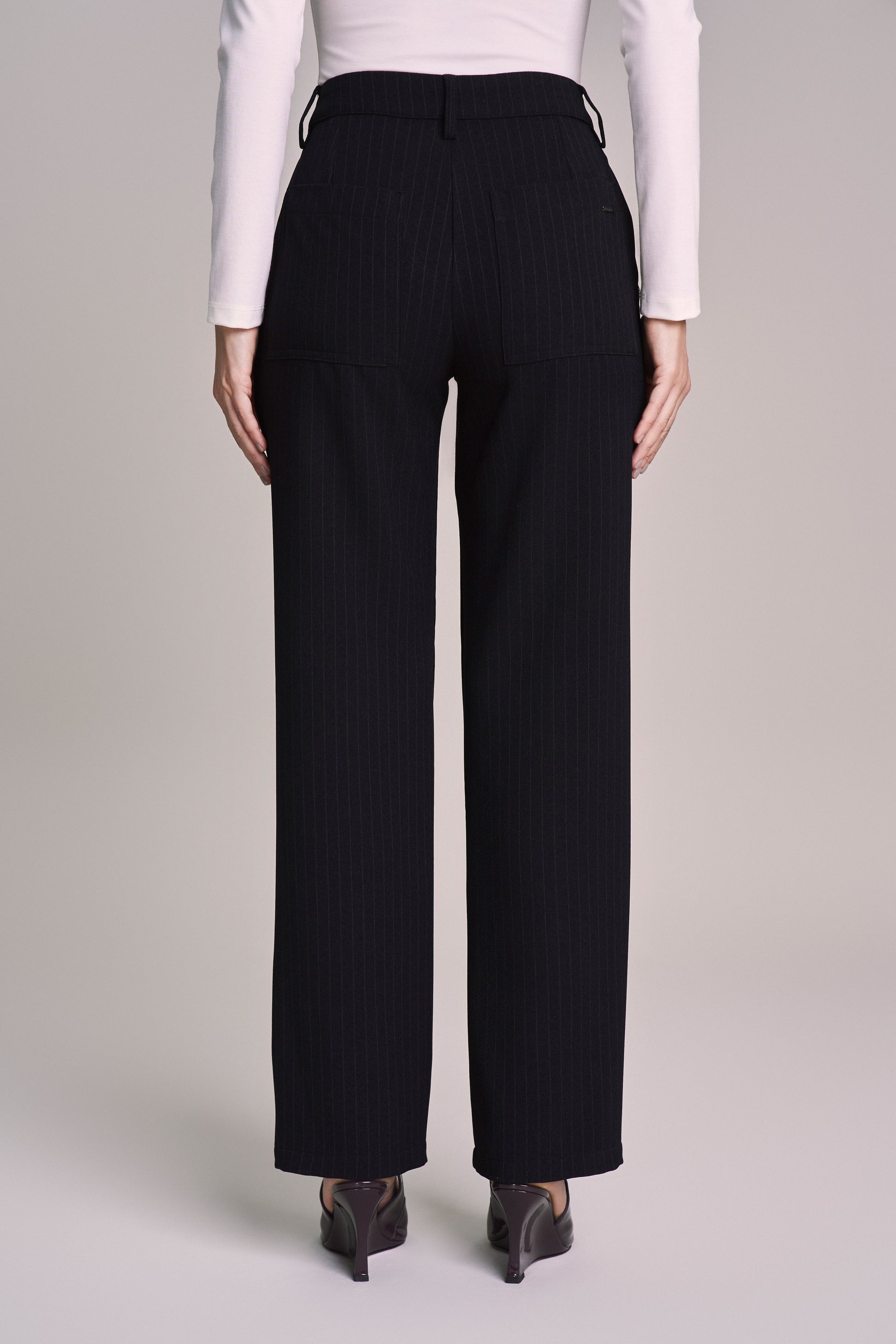 calça crepe reta cintura intermediária alfaiataria risca de giz