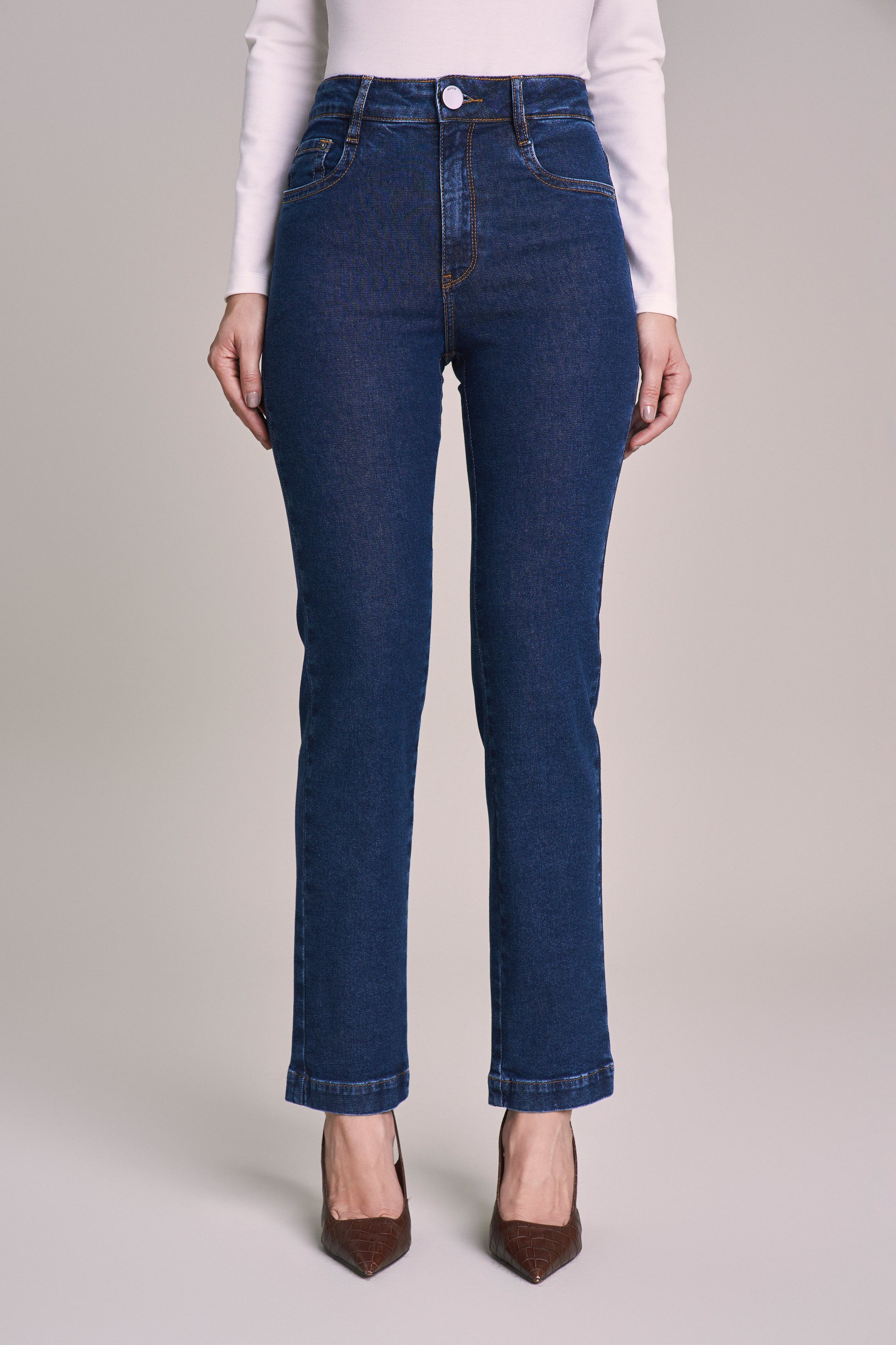calça jeans reta cintura intermediária com pespontos largos