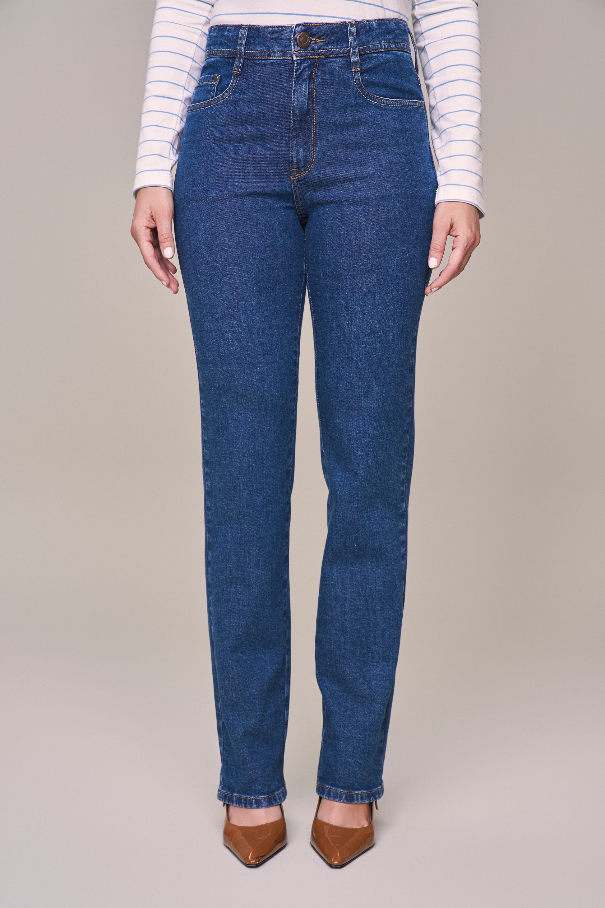 calça jeans reta cintura intermediária com bordado