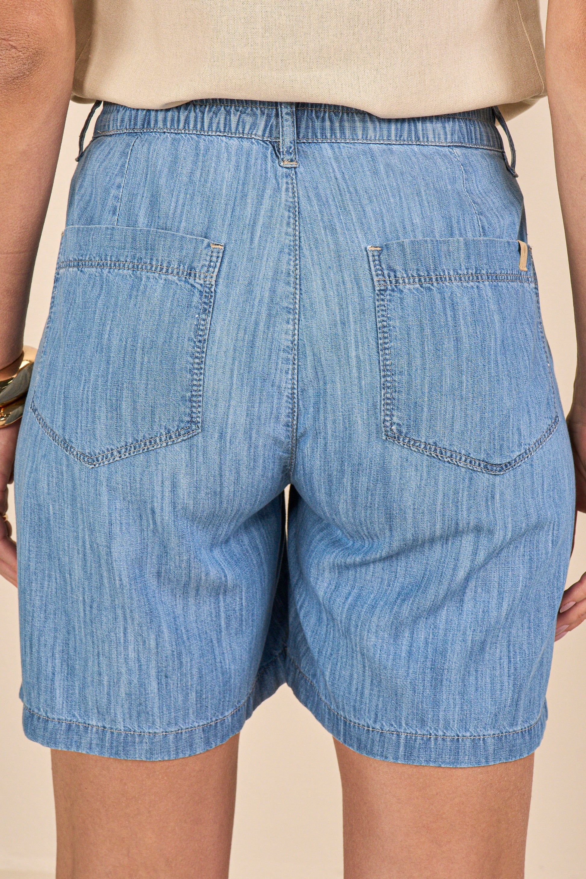 bermuda jeans midi cintura intermediária com pregas solta ao corpo jeans leve cos elastico para maior conforto use para um look casual 67% viscose 33% algodão