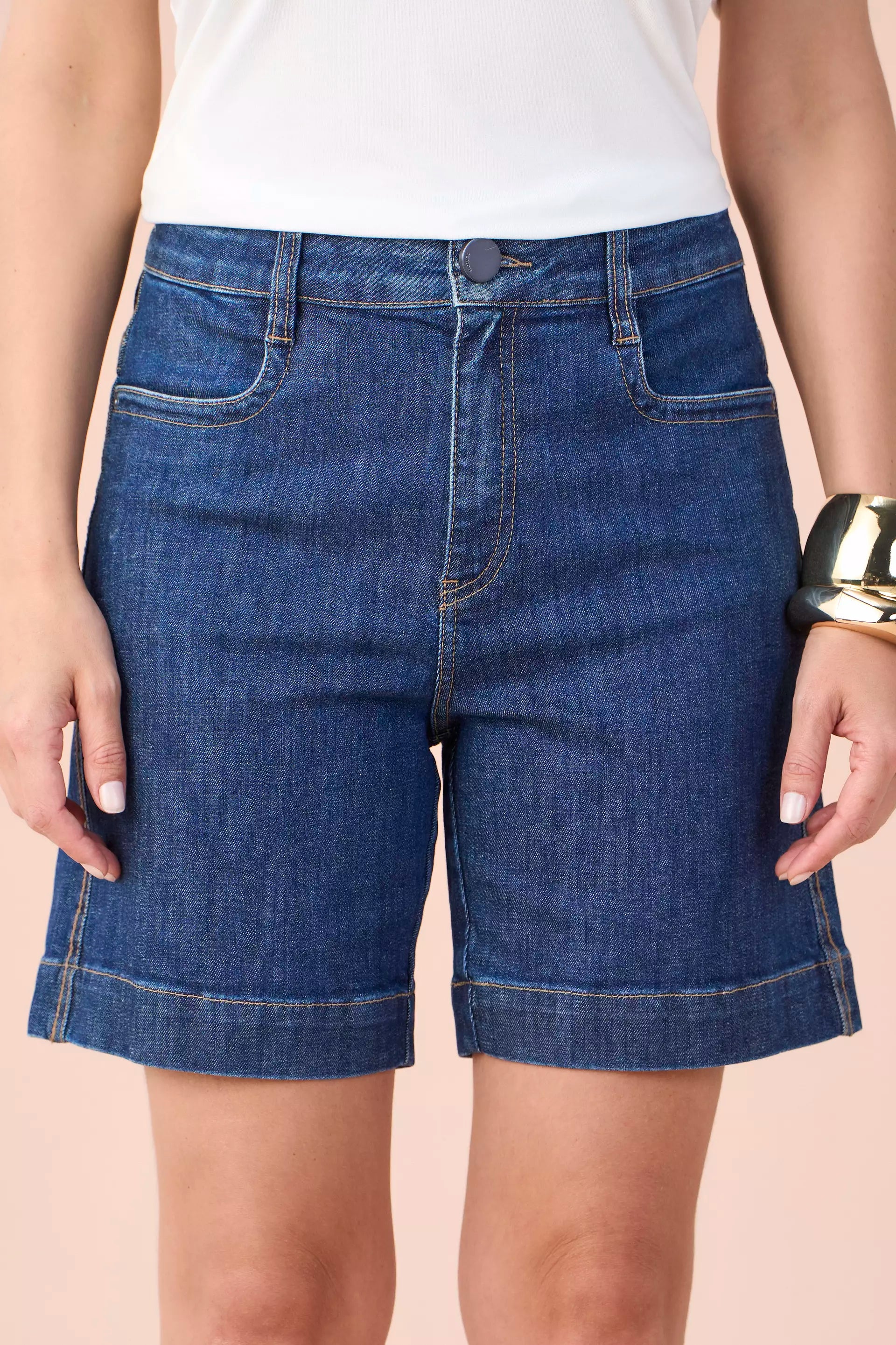 bermuda jeans midi cintura intermedíaria tradicional solta ao corpo jeans estruturado tradicional use para um look casual 98% algodao 2% elastano