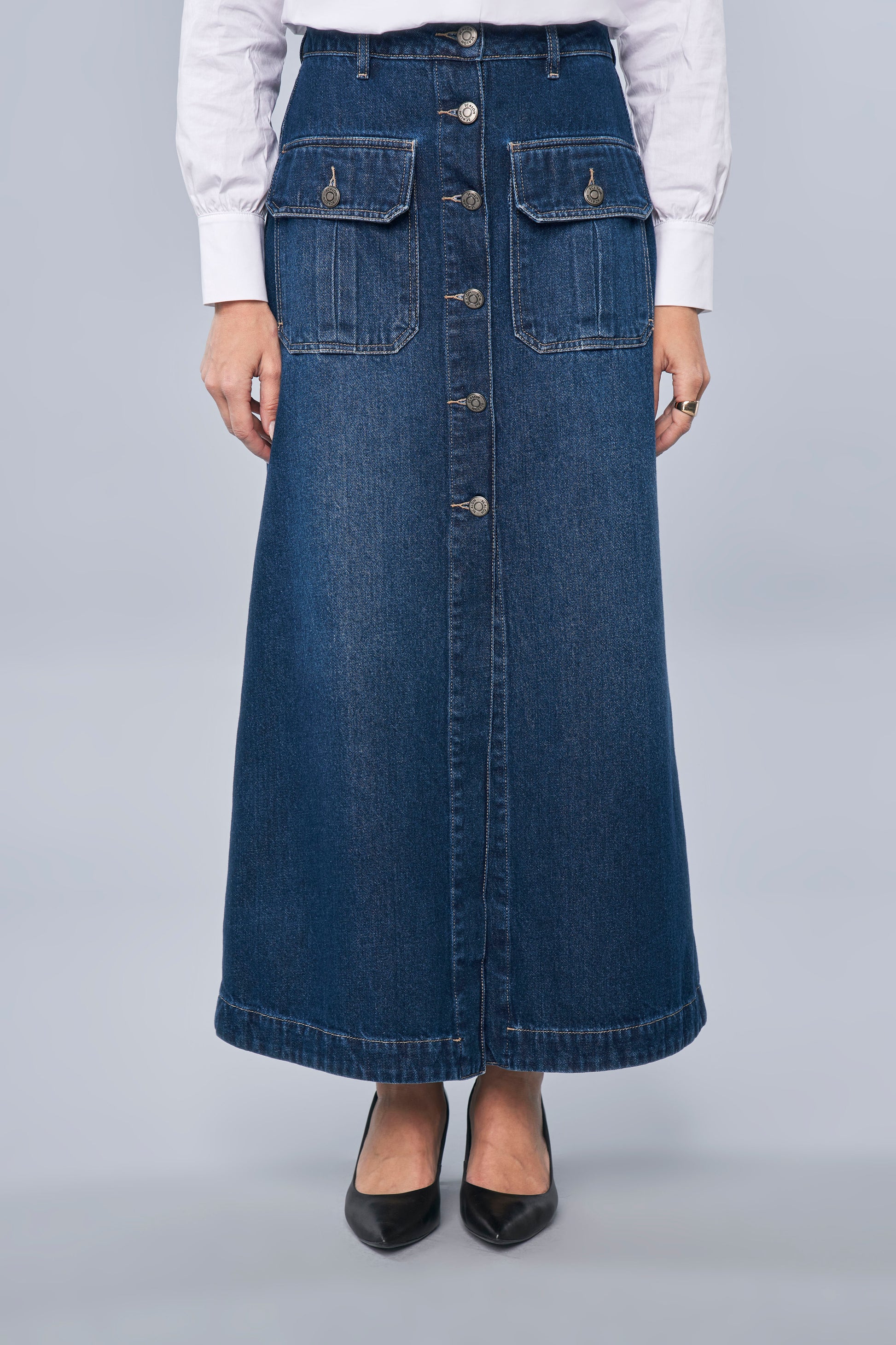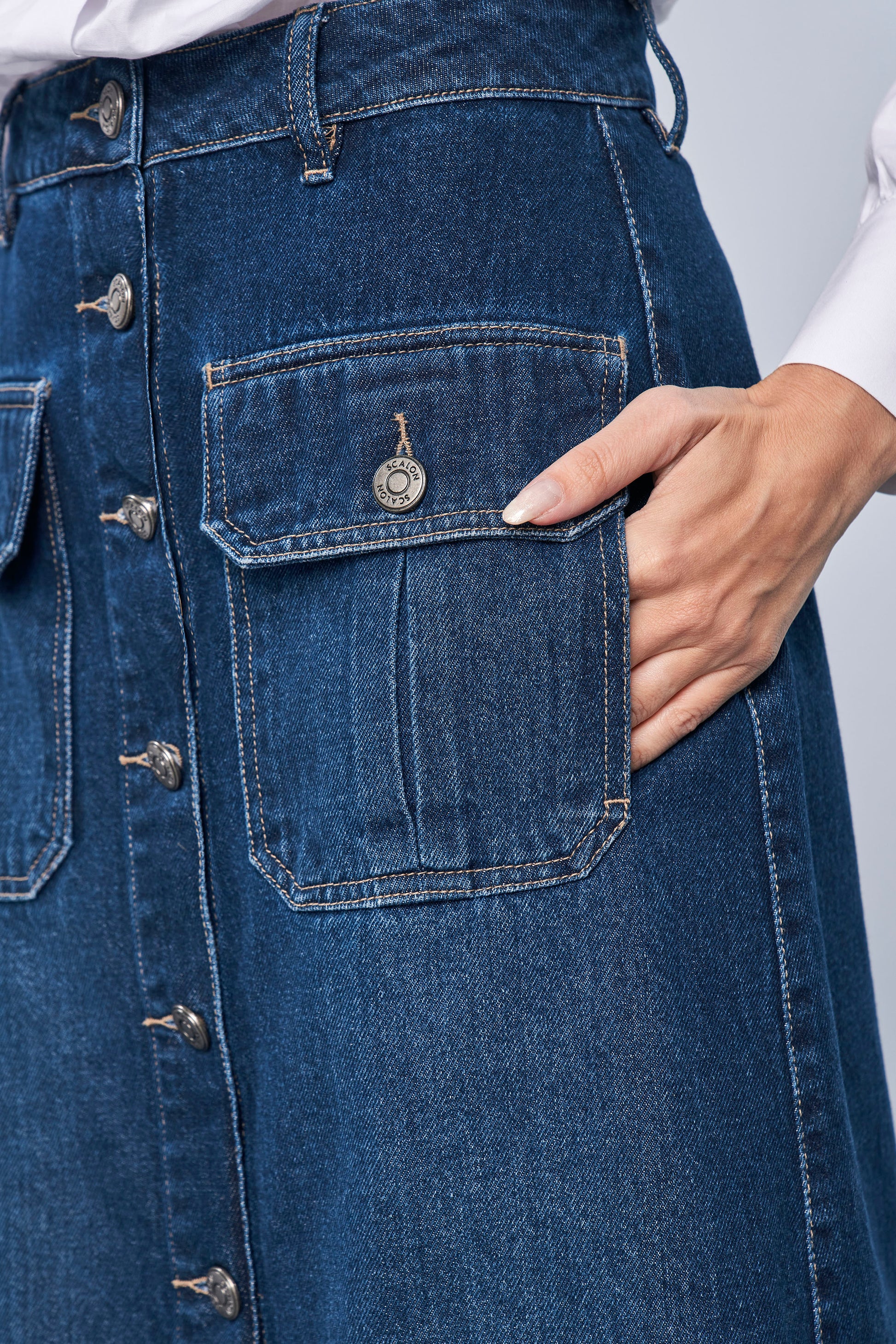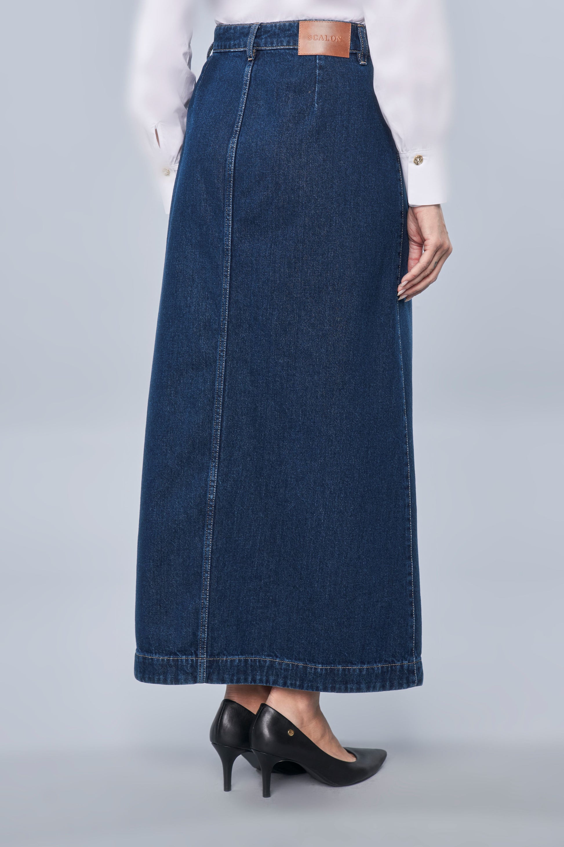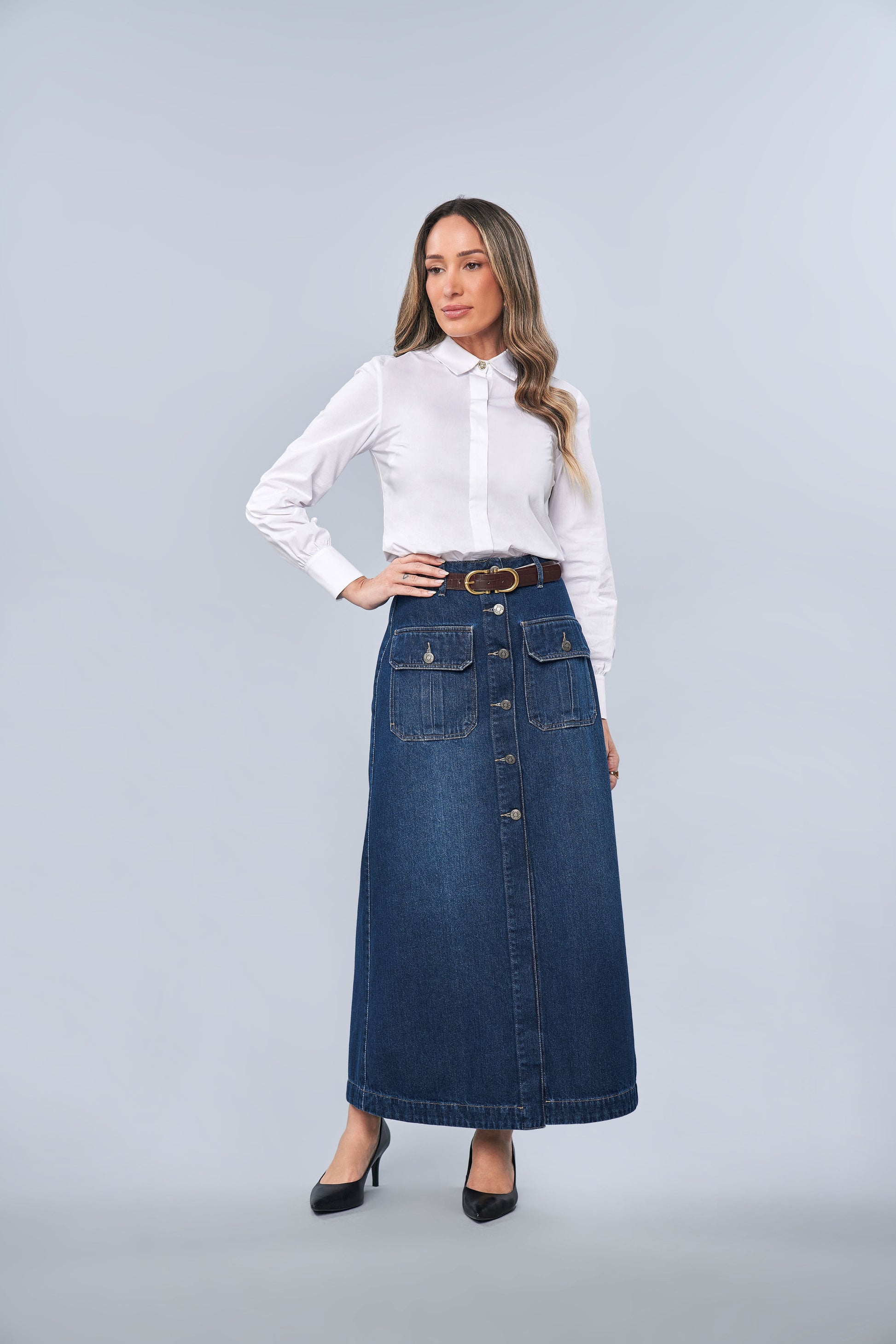 saia jeans longuete cintura intermediária com bolsos cargos solto ao corpo jeans estruturado bolsos sobrepostos use para um look casual 100% algodão