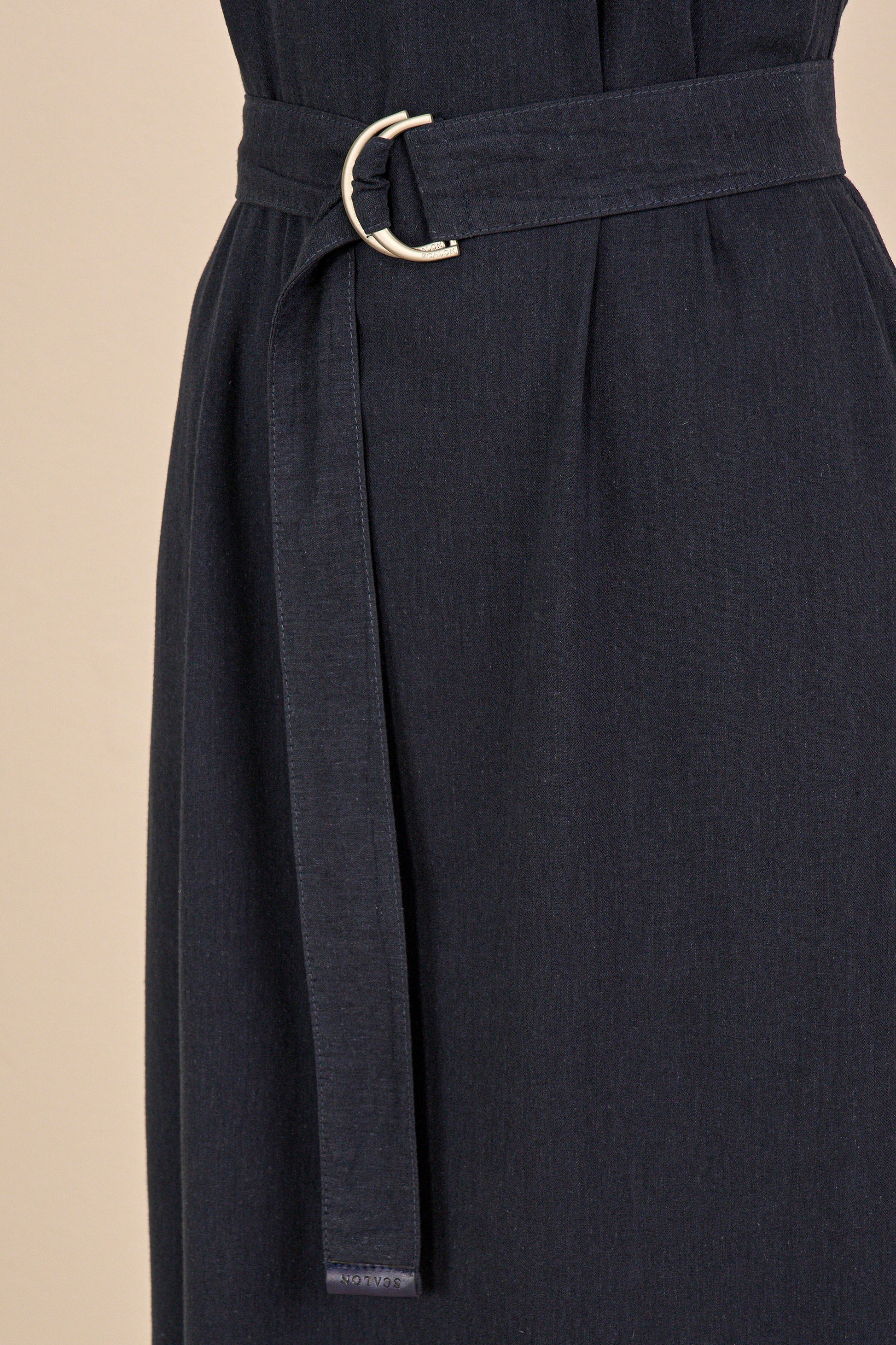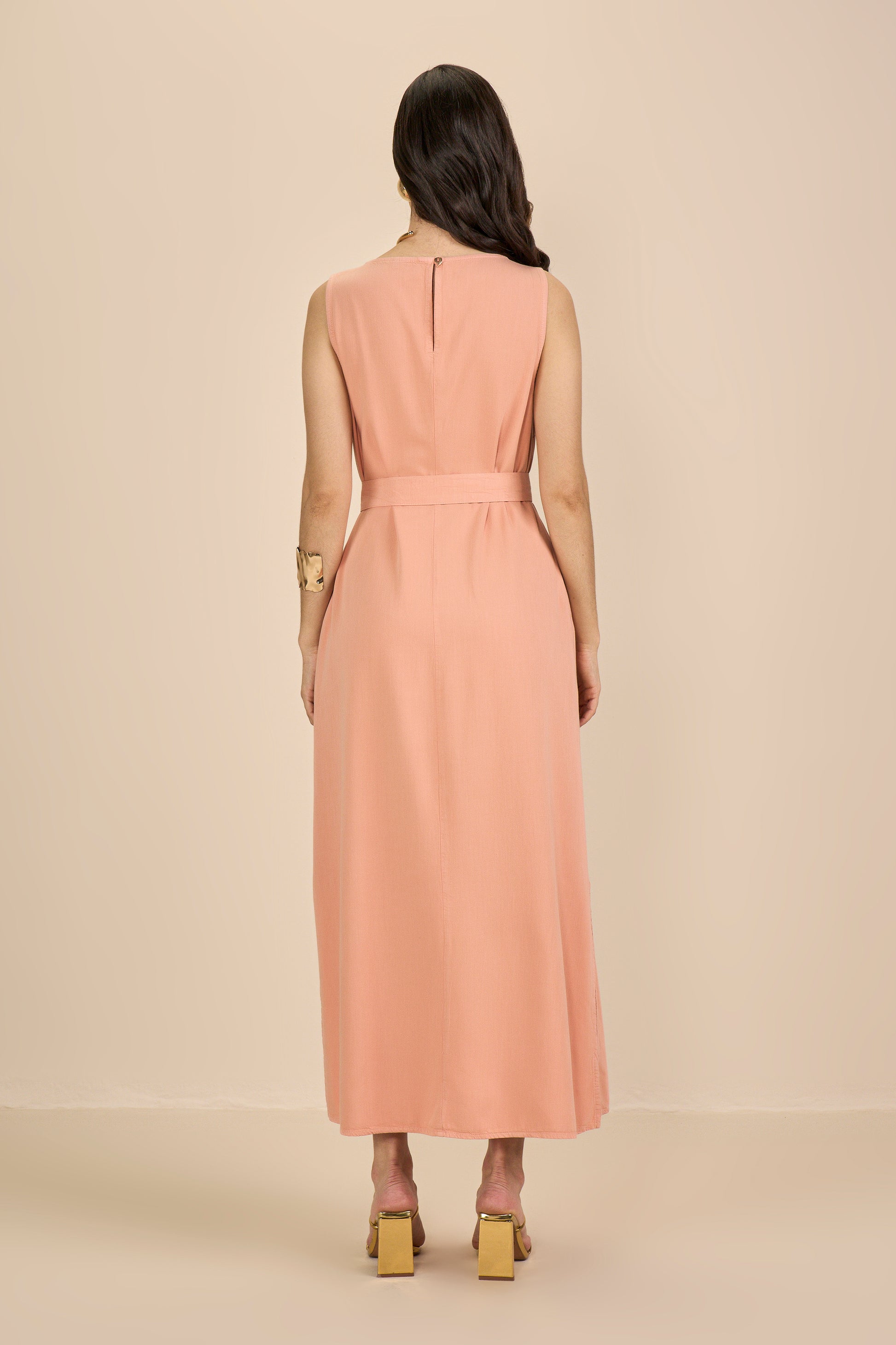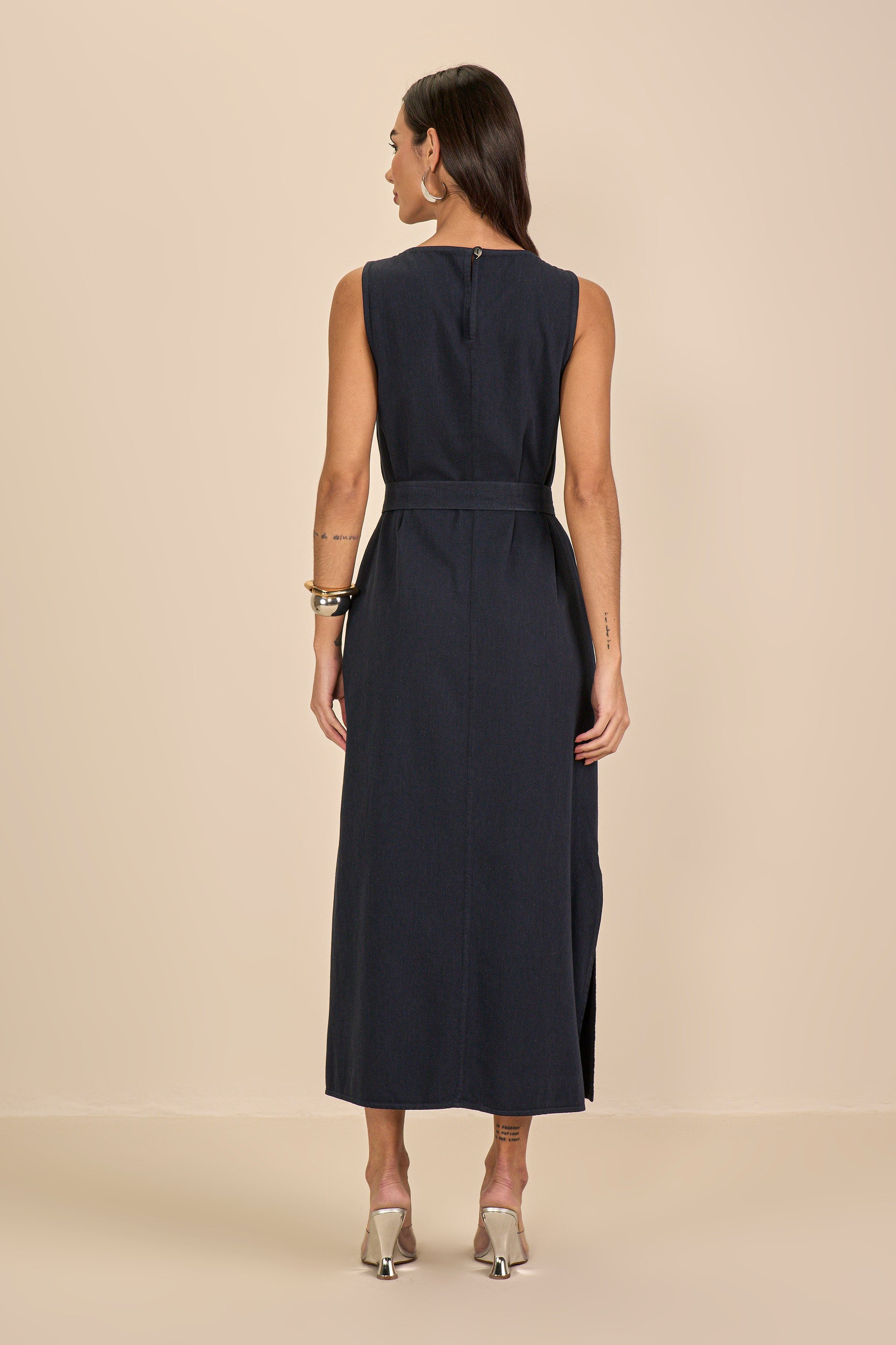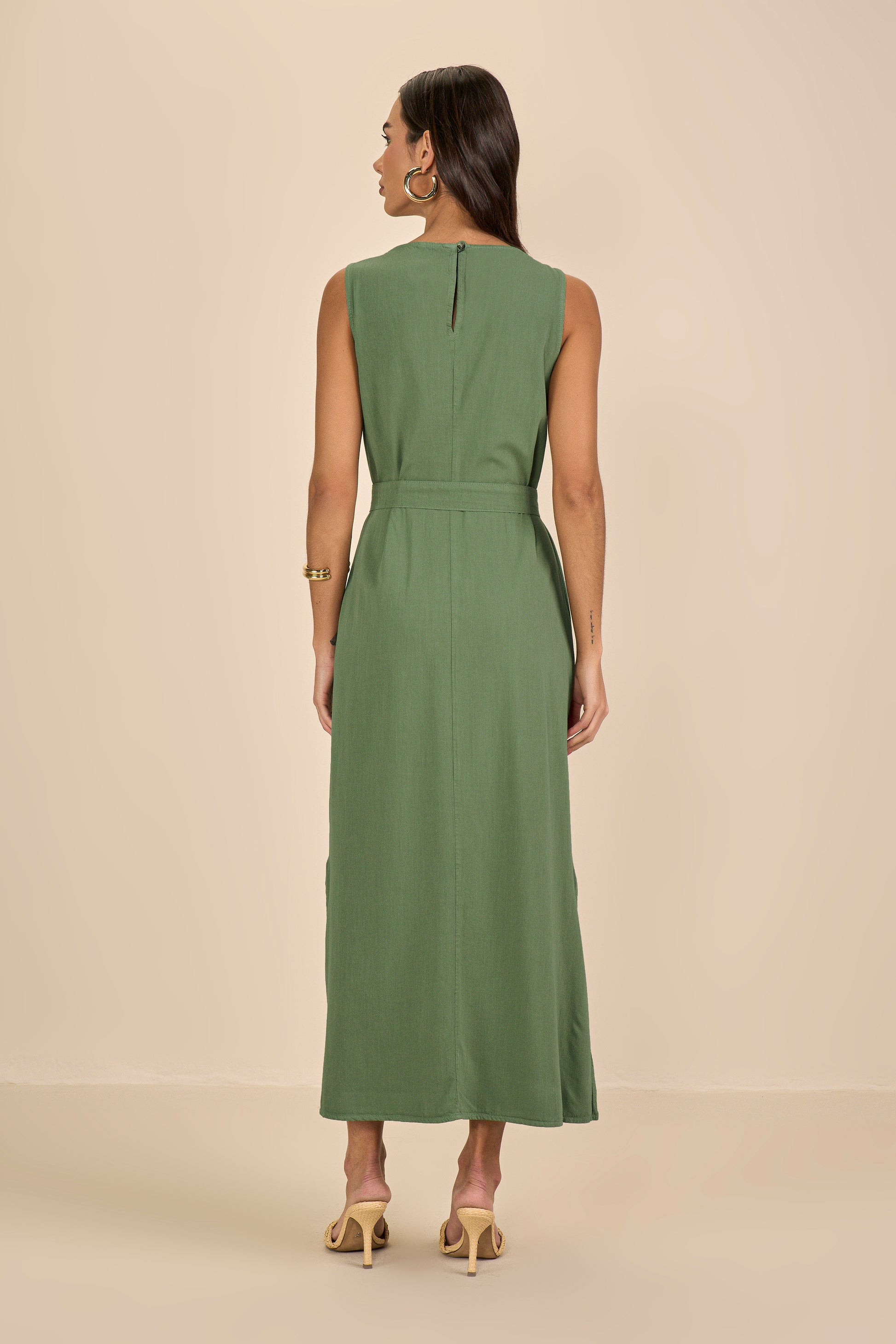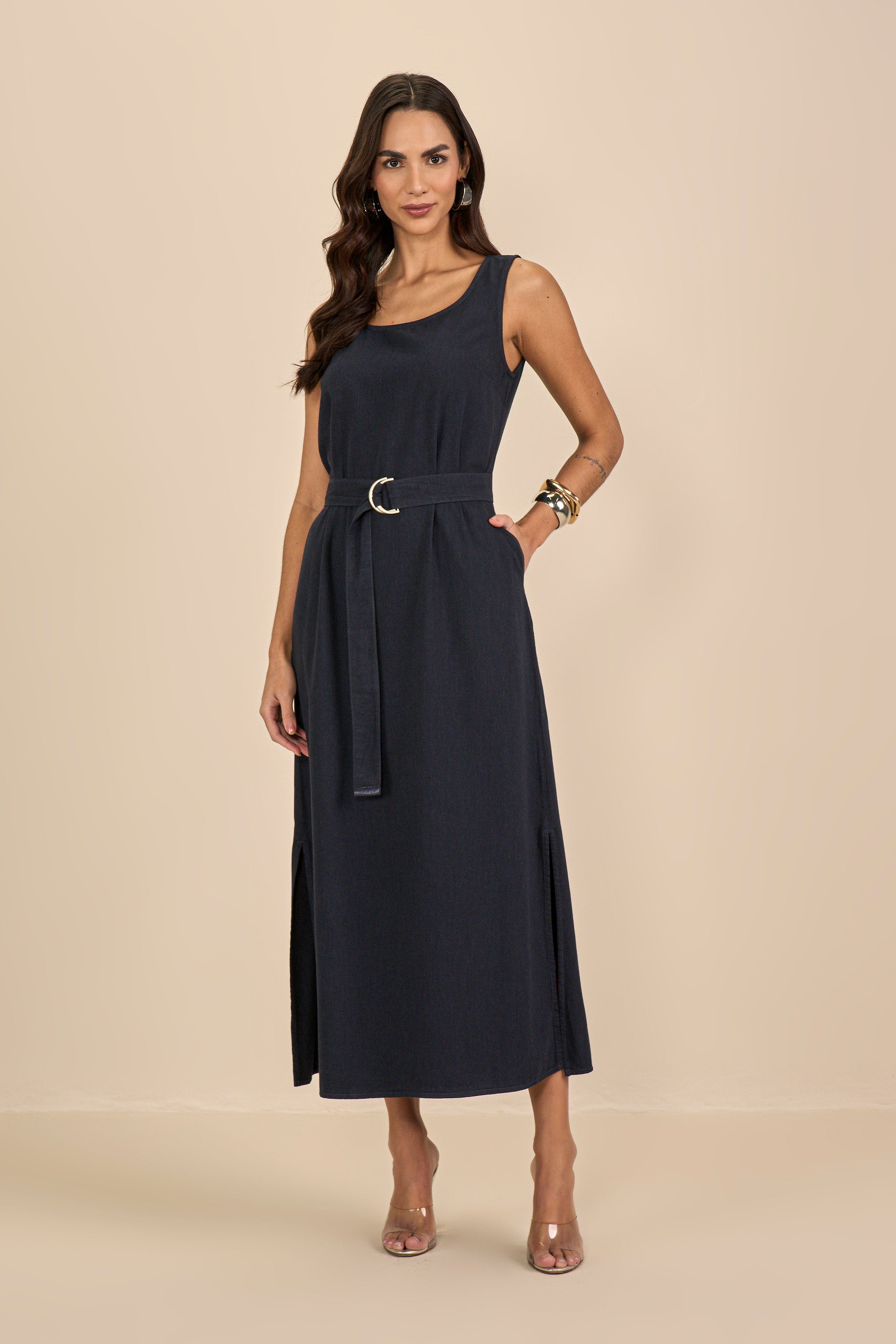 vestido sarja longuete alça larga com faixa