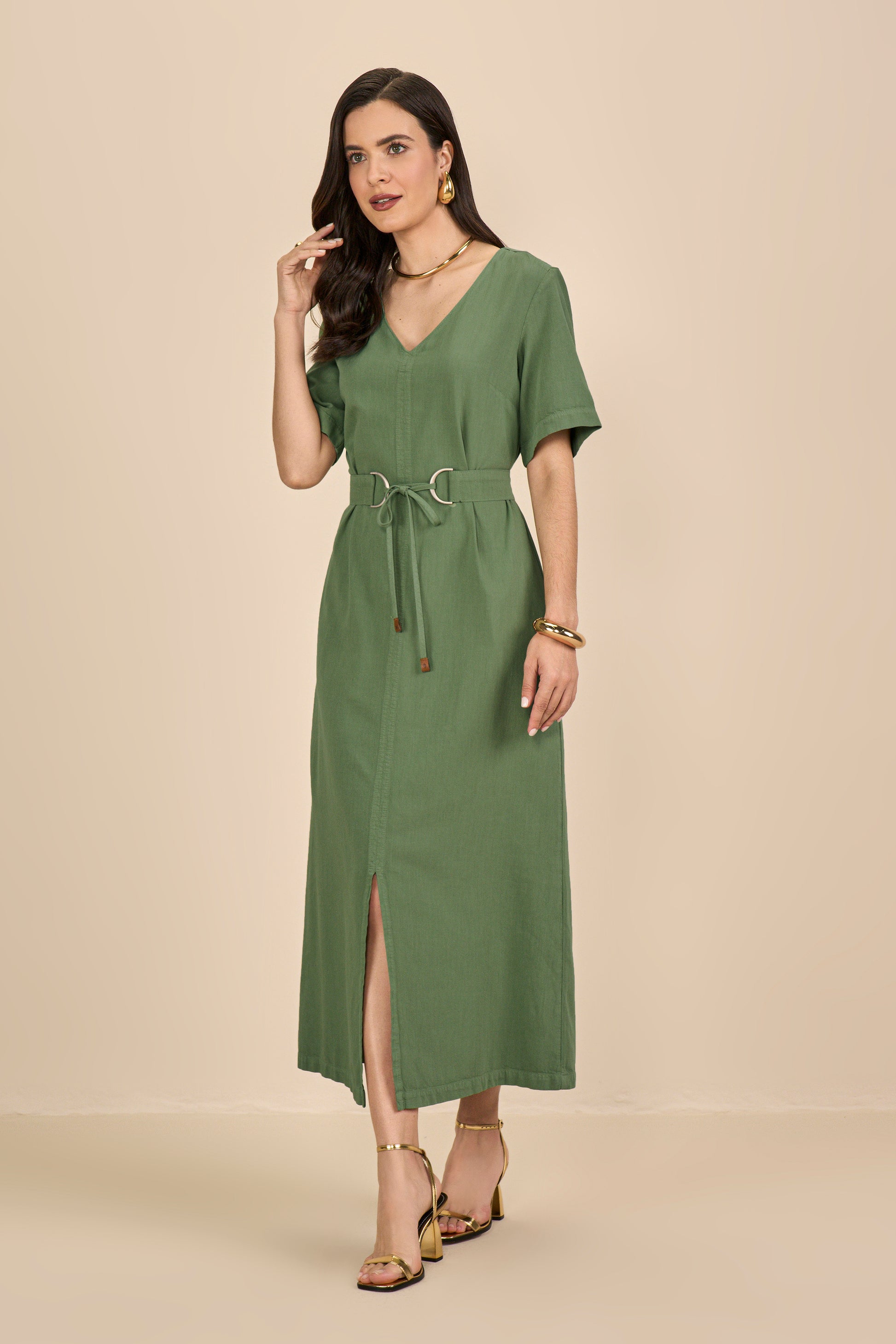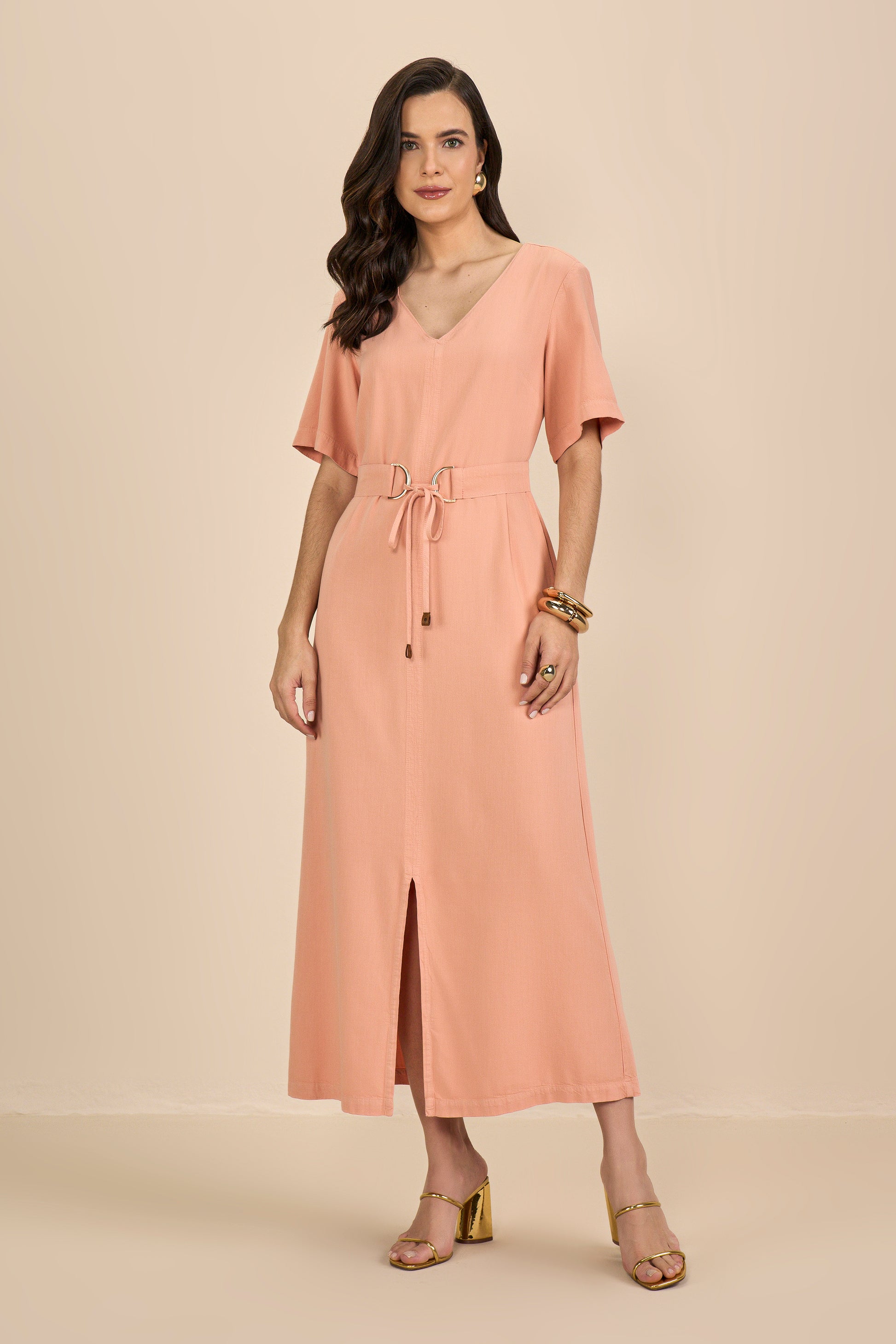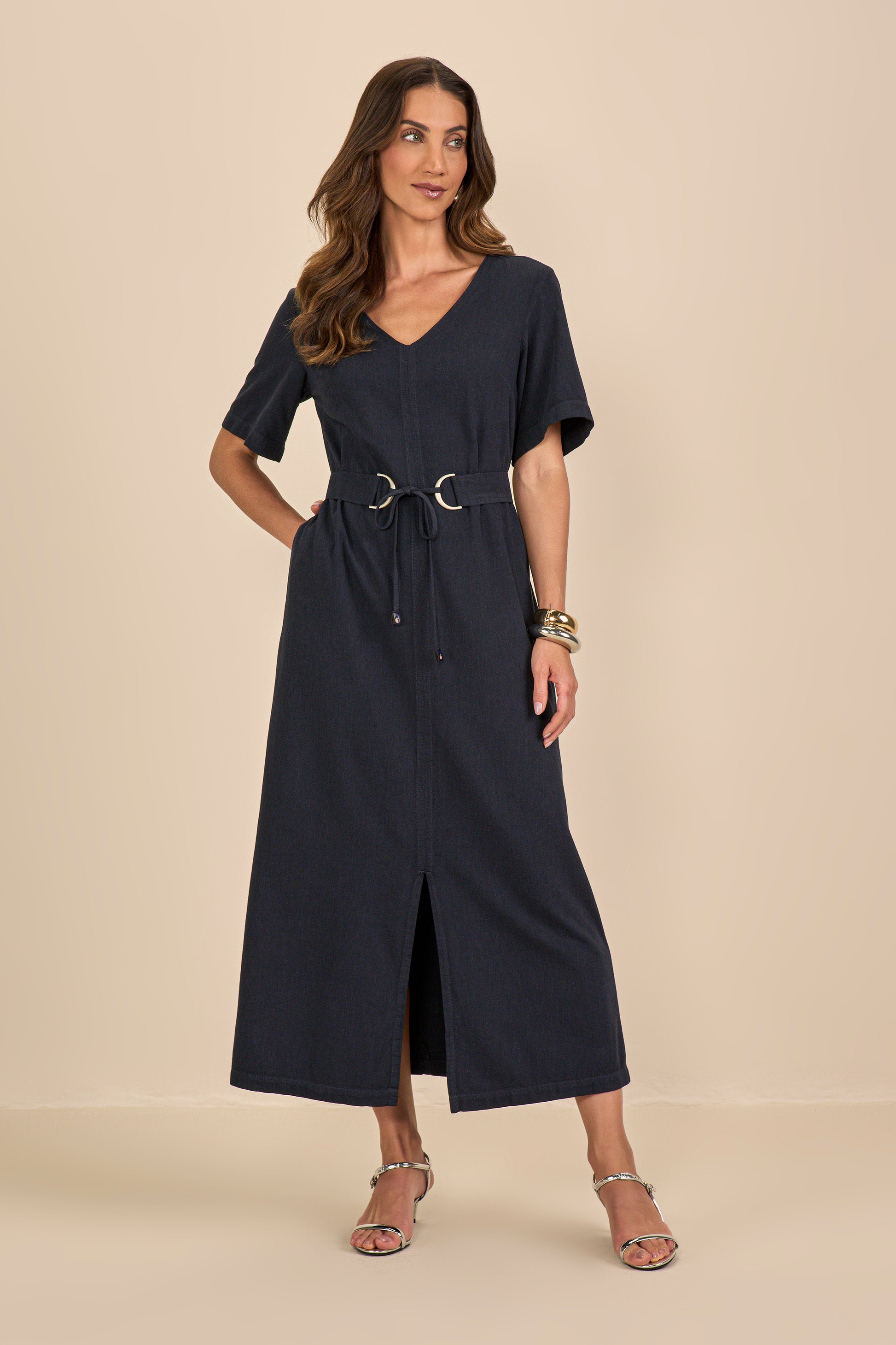 vestido sarja longuete manga curta com faixa solto ao corpo sarja leve faixa use para um look casual 67% viscose 33% algodão