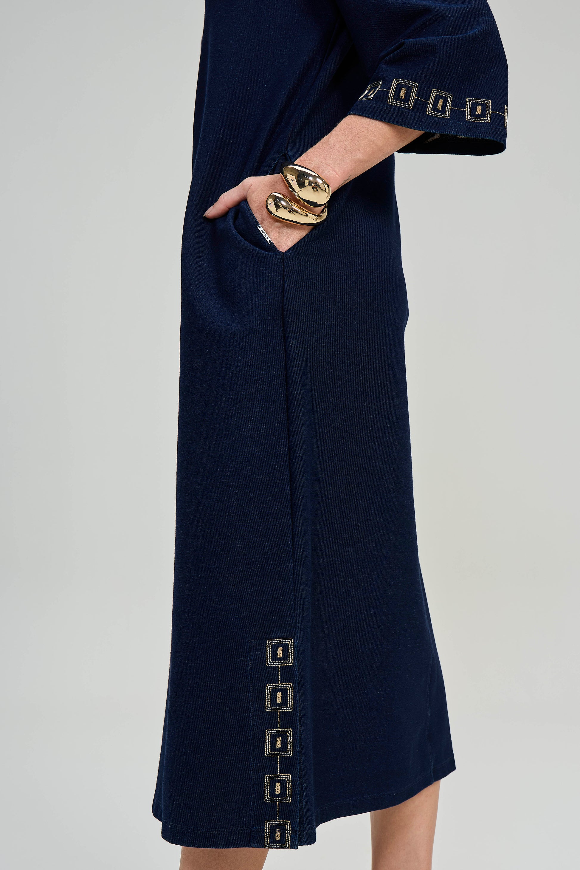 vestido malha denim midi manga 3/4 com bordado solto ao corpo malha denim bordado use para um look casual 50% algodao 43% poliester 7% elastano