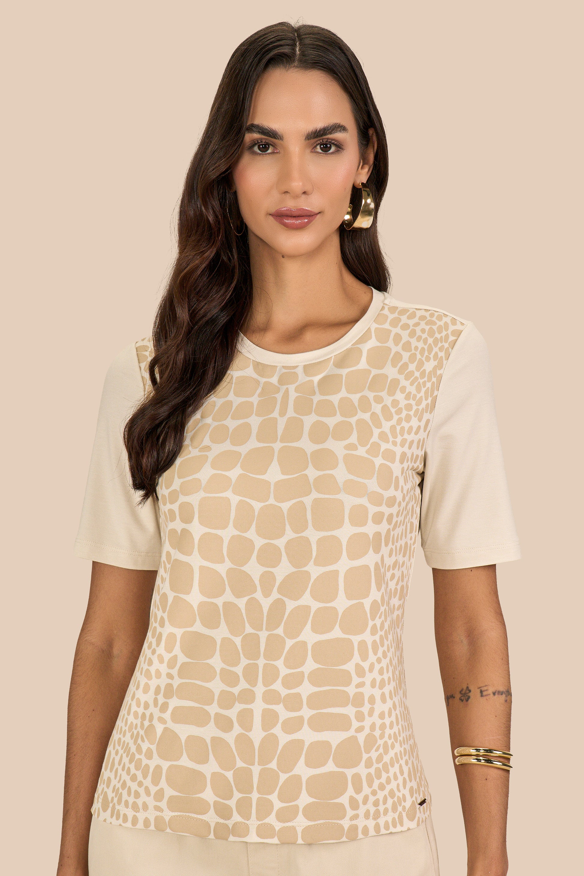 t-shirt malha manga curta estampada solta ao corpo malha leve estampa use para um look casual 94% viscose 6% elastano