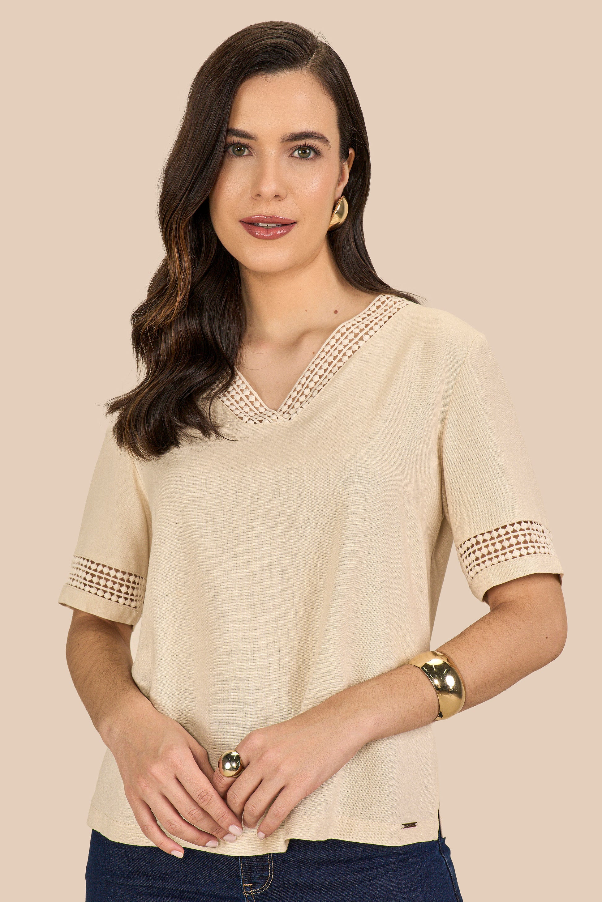 blusa viscose manga curta com entremeios solto ao corpo viscose entremeio use para um look casual 70%viscose 30%linho