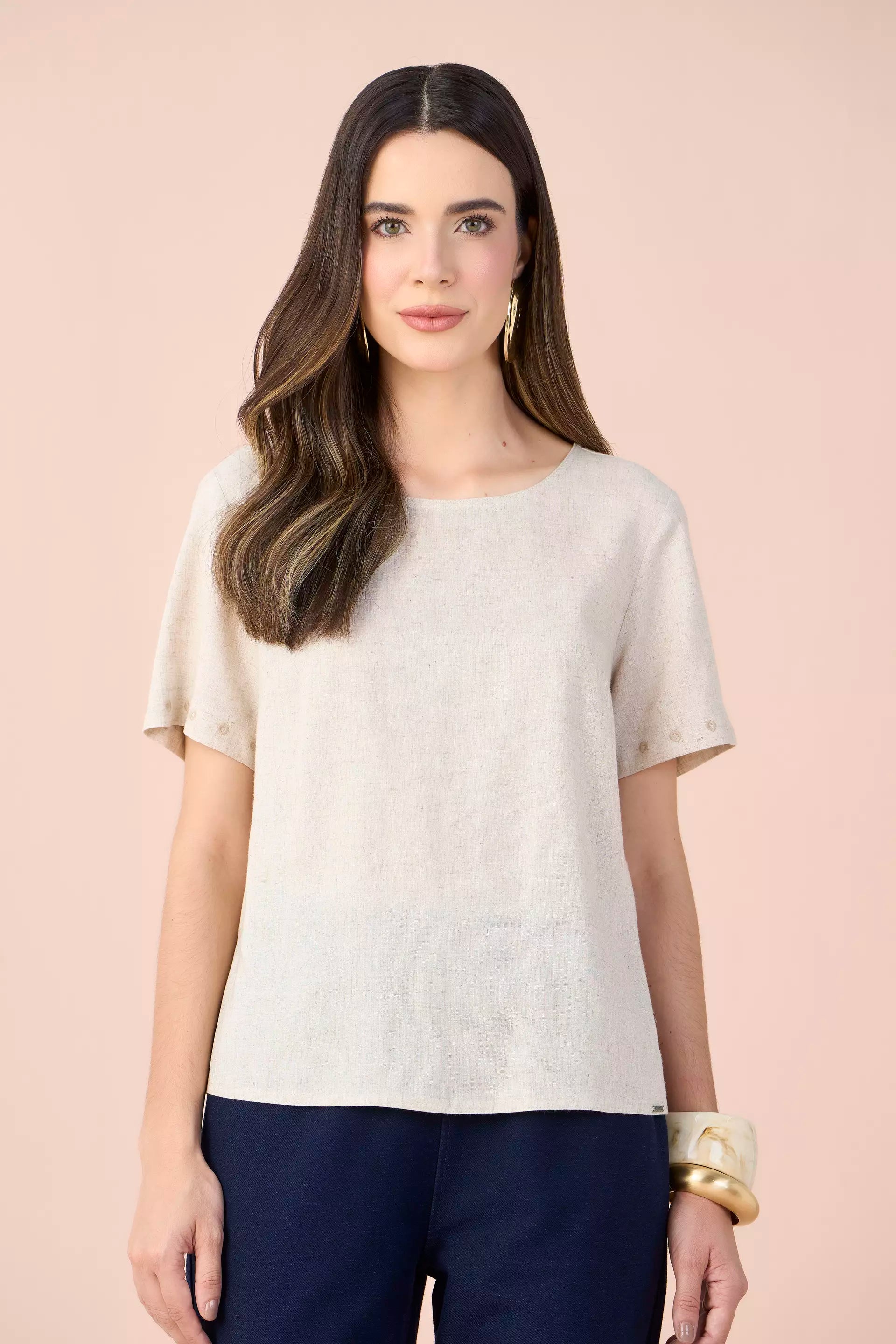 blusa viscose manga curta com bordado solta ao corpo viscose leve abertura lateral use para um look casual 70% viscose 30% linho