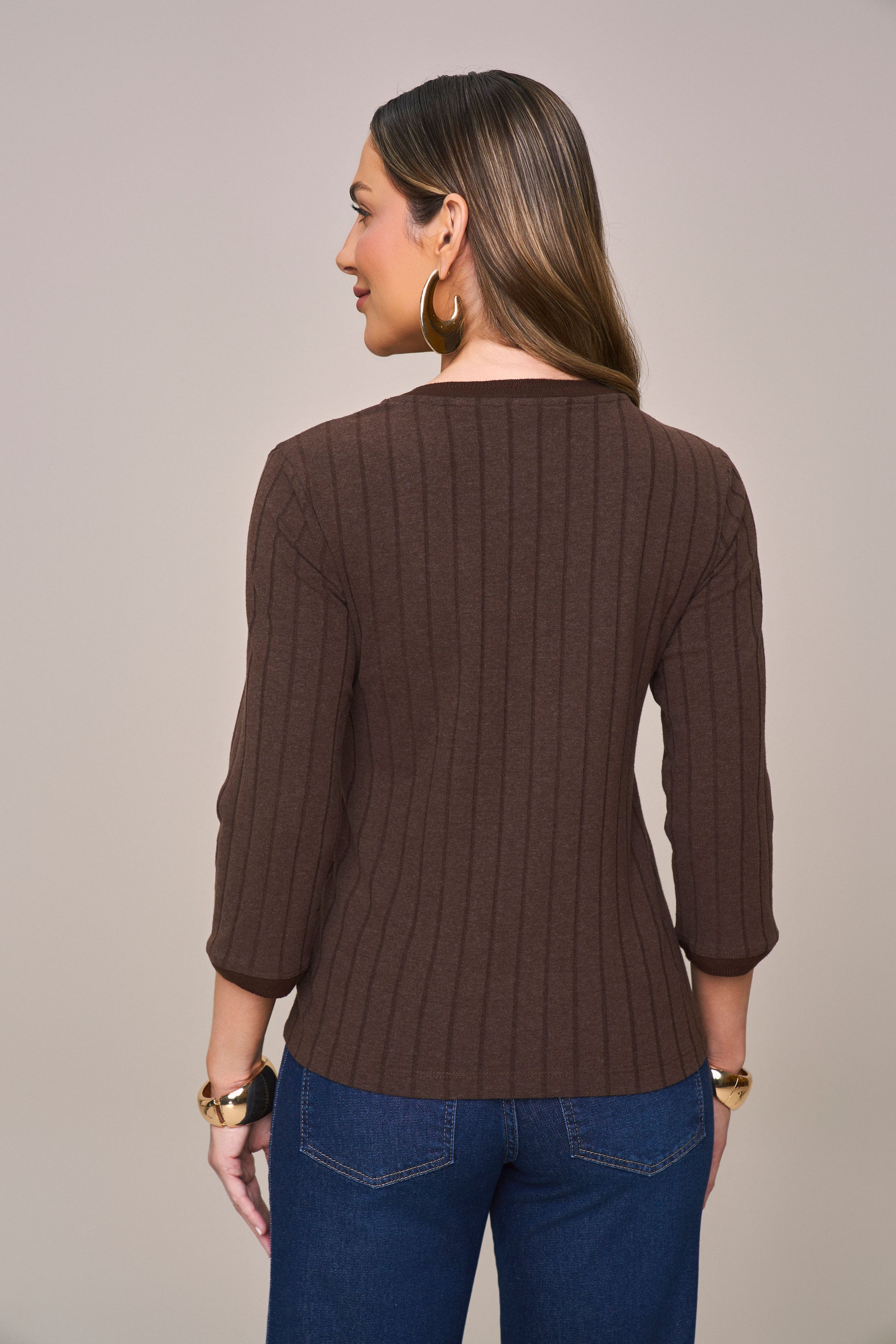 blusa malha canelada manga 3/4 com tricot justo ao corpo malha tricot use para um look casual 81% algodão 8% elastano 11% poliéster
