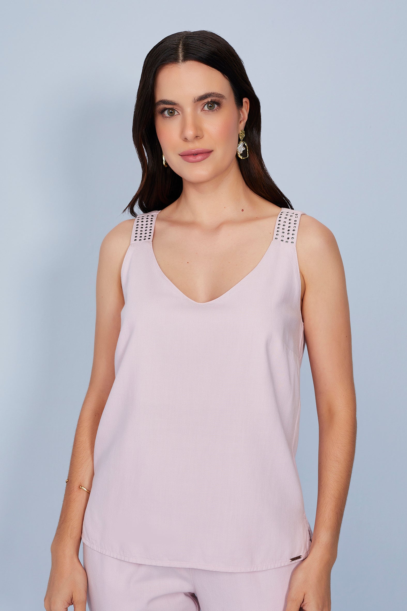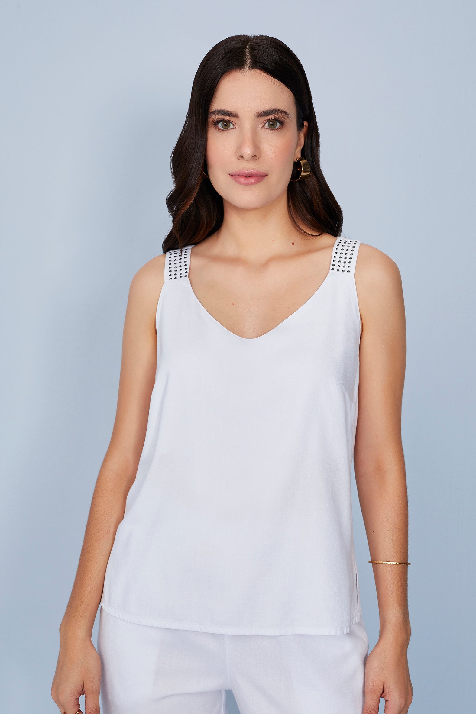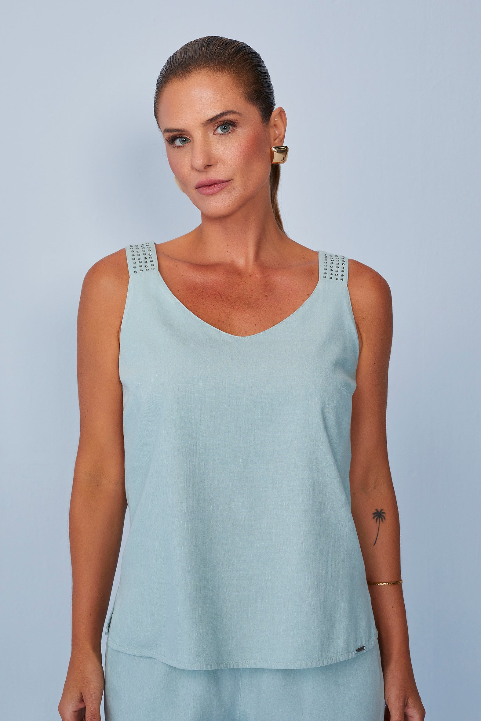 regata sarja alça larga com cristais soltos ao corpo sarja leve cristais use para um look casual 67% viscose 33% algodão