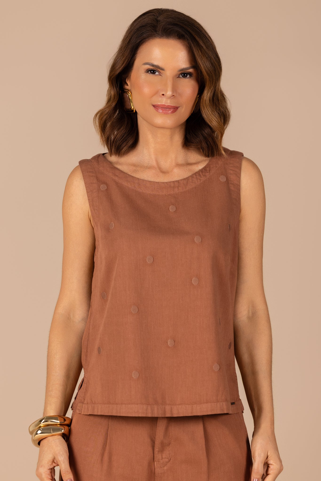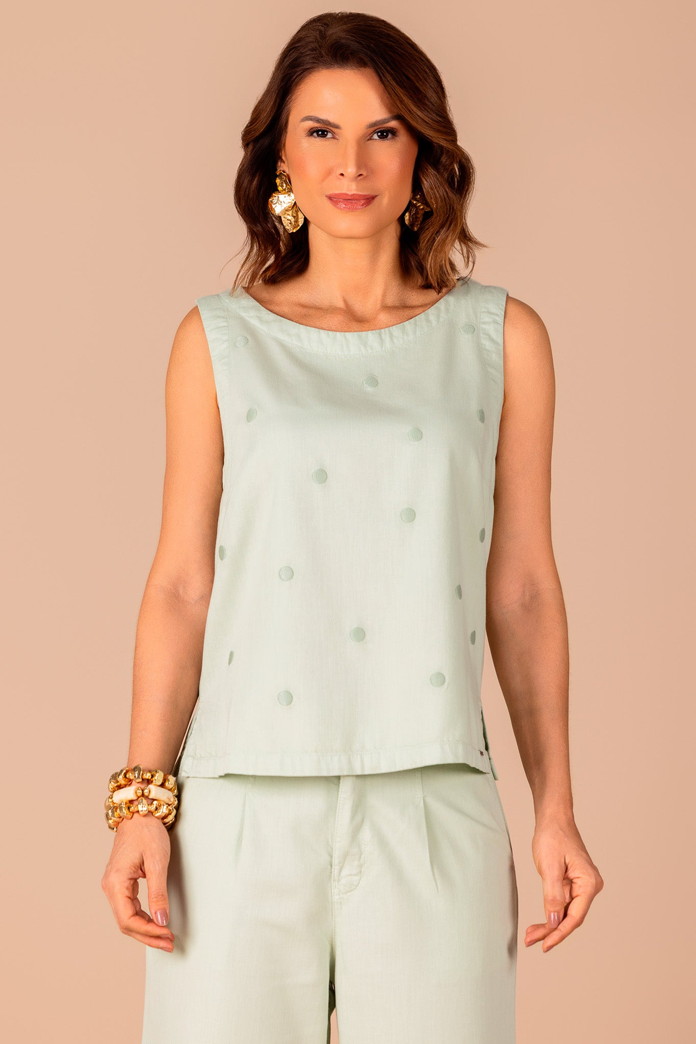 regata sarja alça larga com bordado poá se ajusta naturalmente ao corpo sarja color bordado use para um look casual 67% viscose 33% algodão