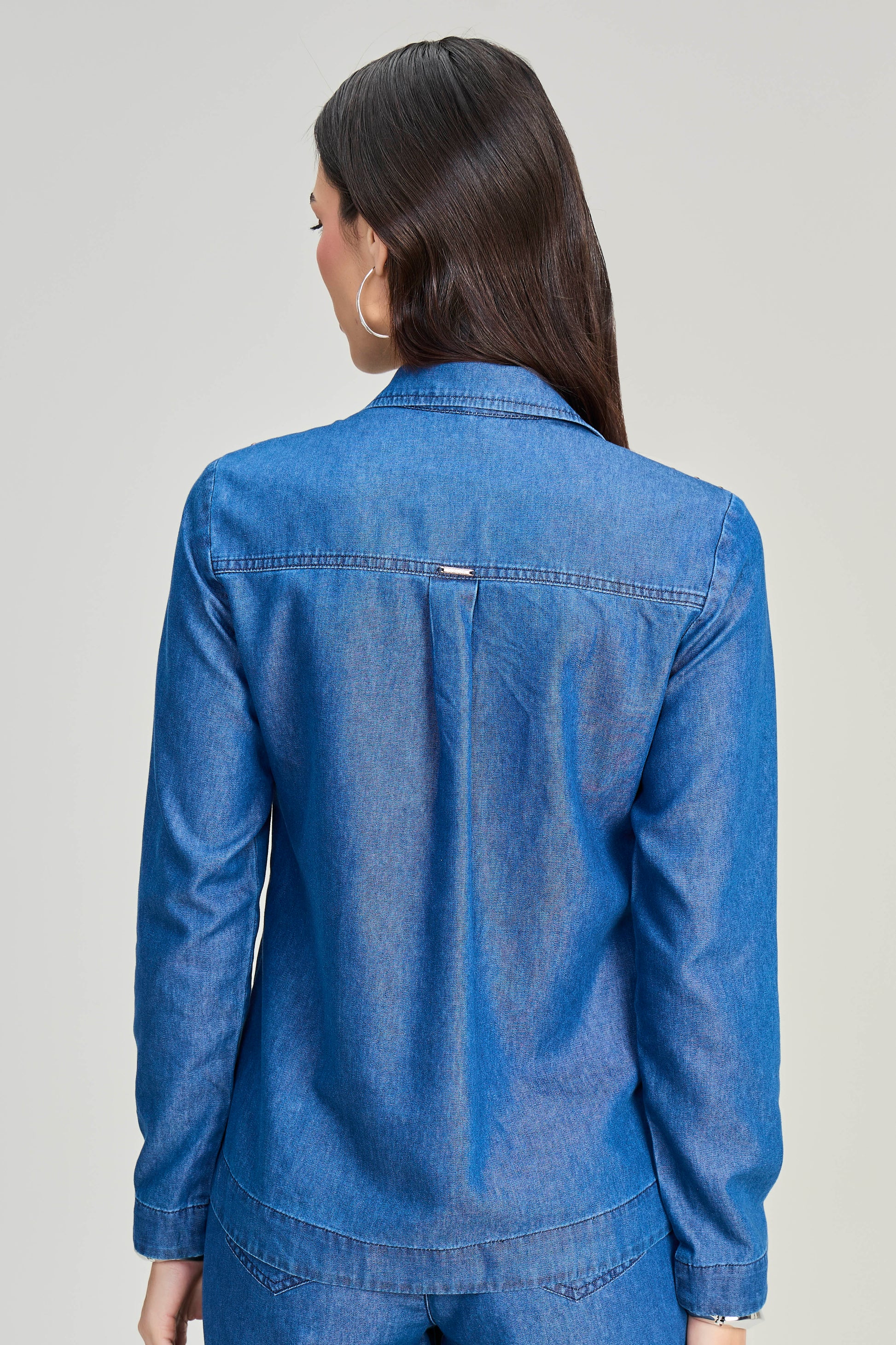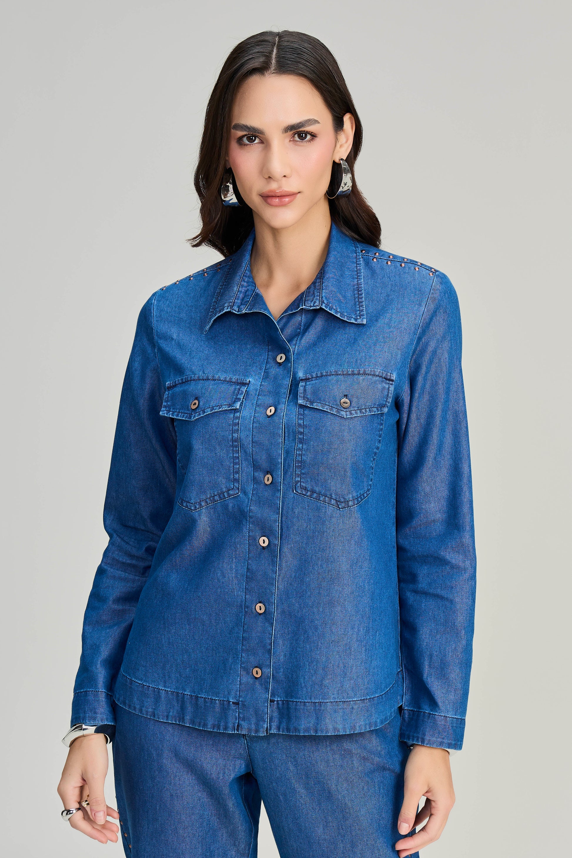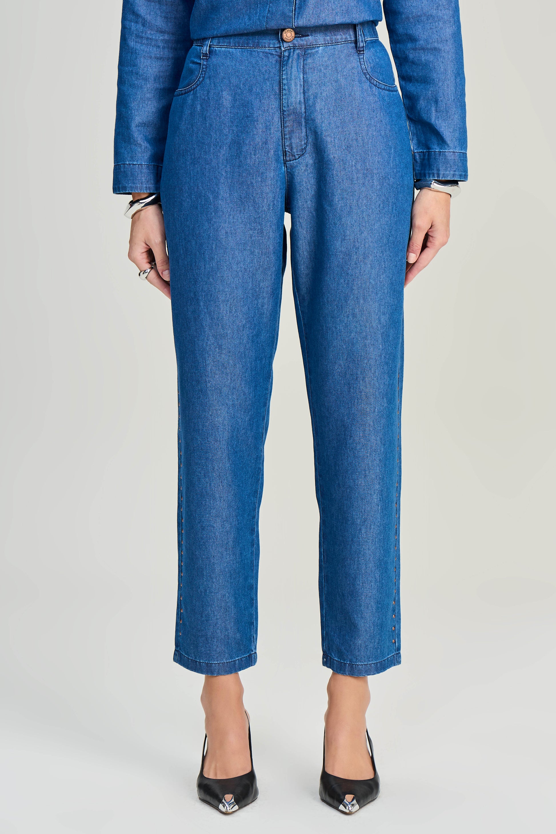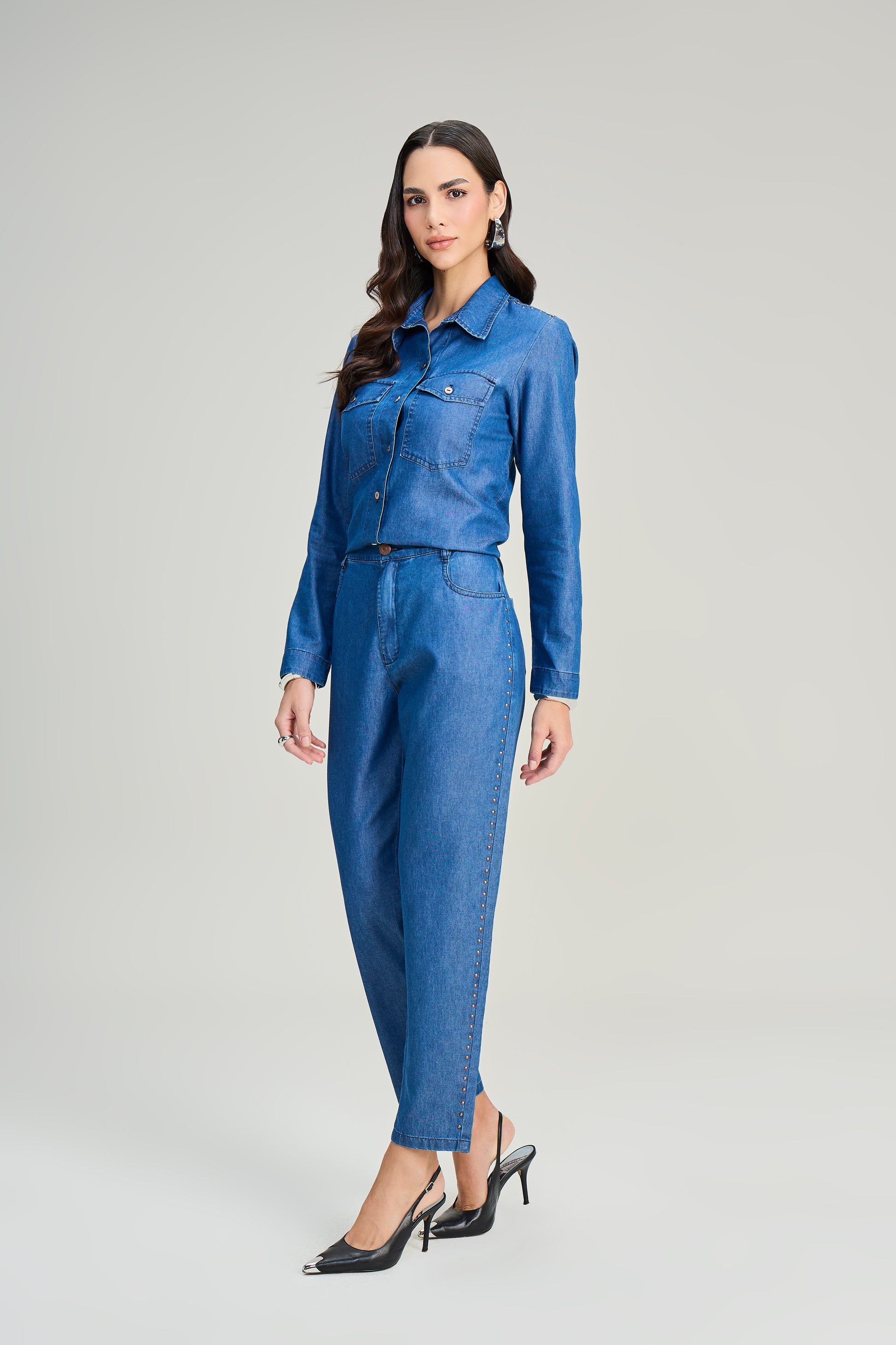 conjunto jeans camisa manga longa e calça mom com tachas solto ao corpo jeans leve tachas use para um look casual 65% algodão 35% liocel