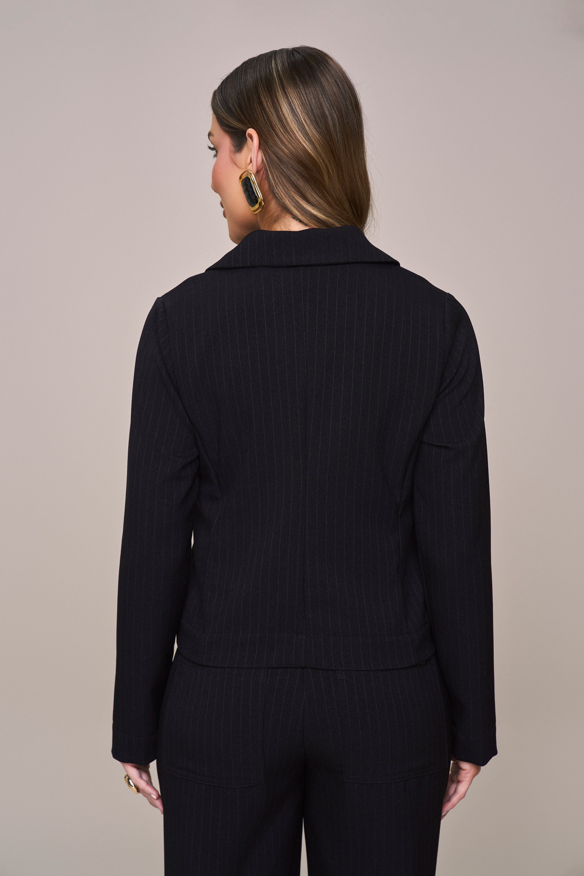 conjunto crepe casaco manga longa e calça reta cintura intermediária risca de giz solta ao corpo crepe estruturado recortes use para um look casual 100% poliéster