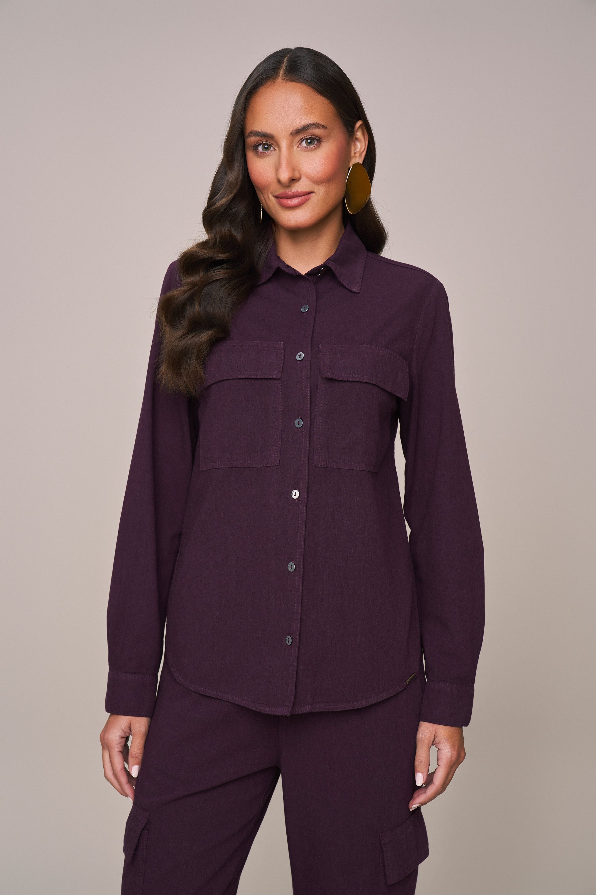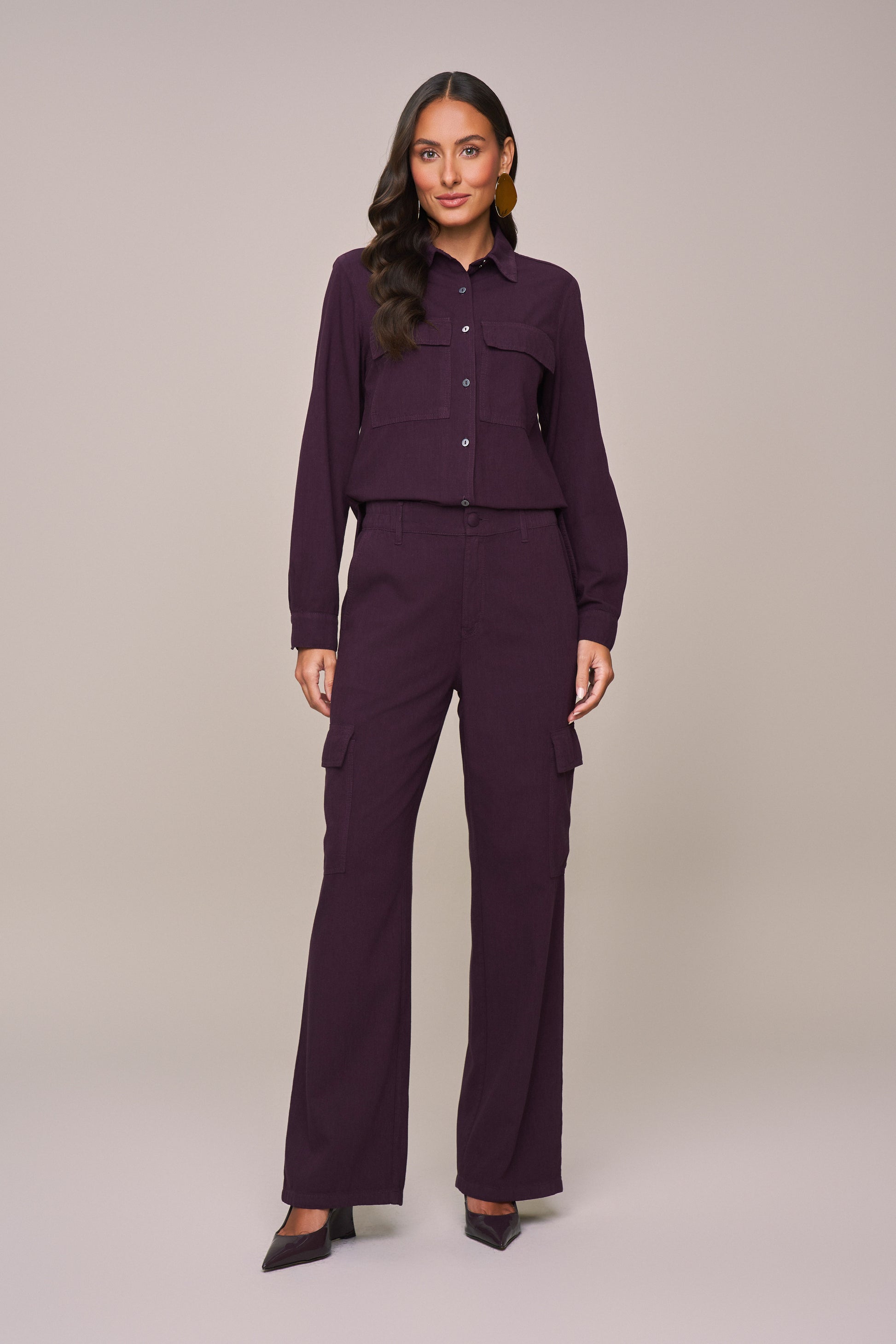 conjunto sarja camisa manga longa e calça wide leg bolsos cargo